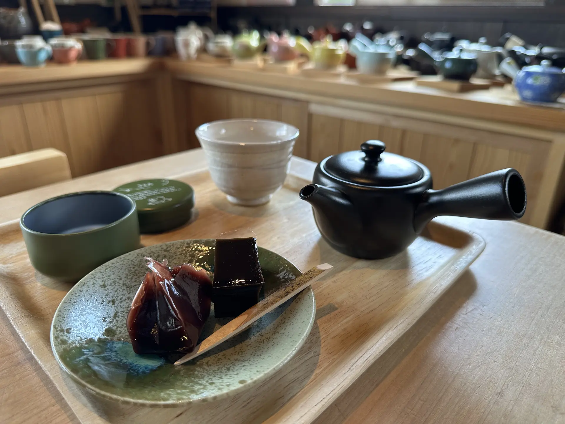 おすすめは、季節の和菓子と一緒に楽しめるお茶のセット。写真は深蒸し茶の濃くてまろやかな味わいの「緑茶セット」です。