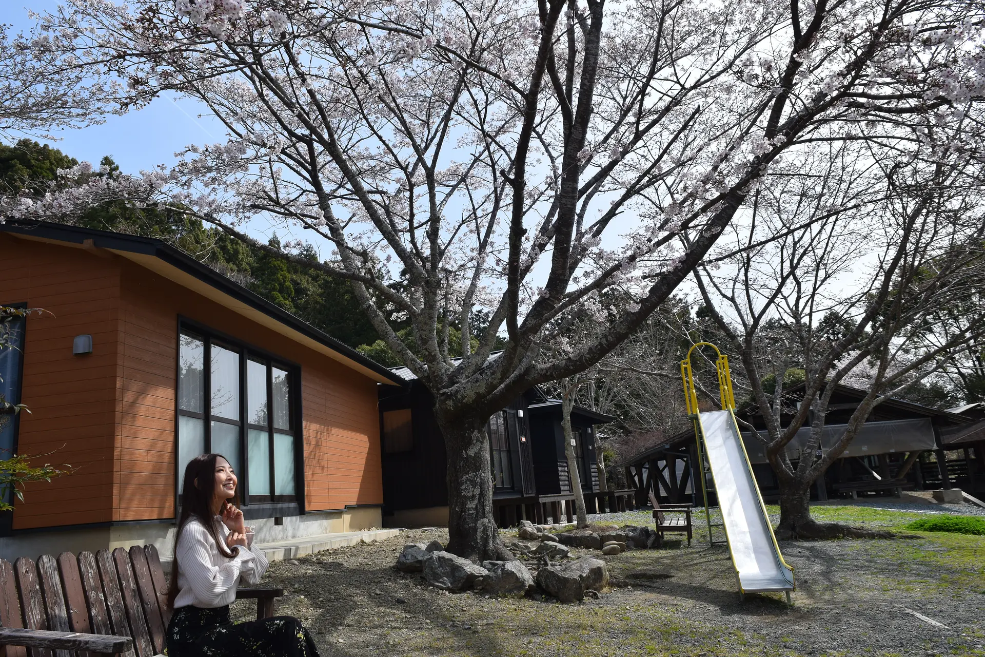 2024年4月2日現在、ごかつら池ふるさと村の看板のある五桂池を囲む桜と、滑り台のあるロッジ、バーベキューエリア周辺の桜がほぼ満開となっています。