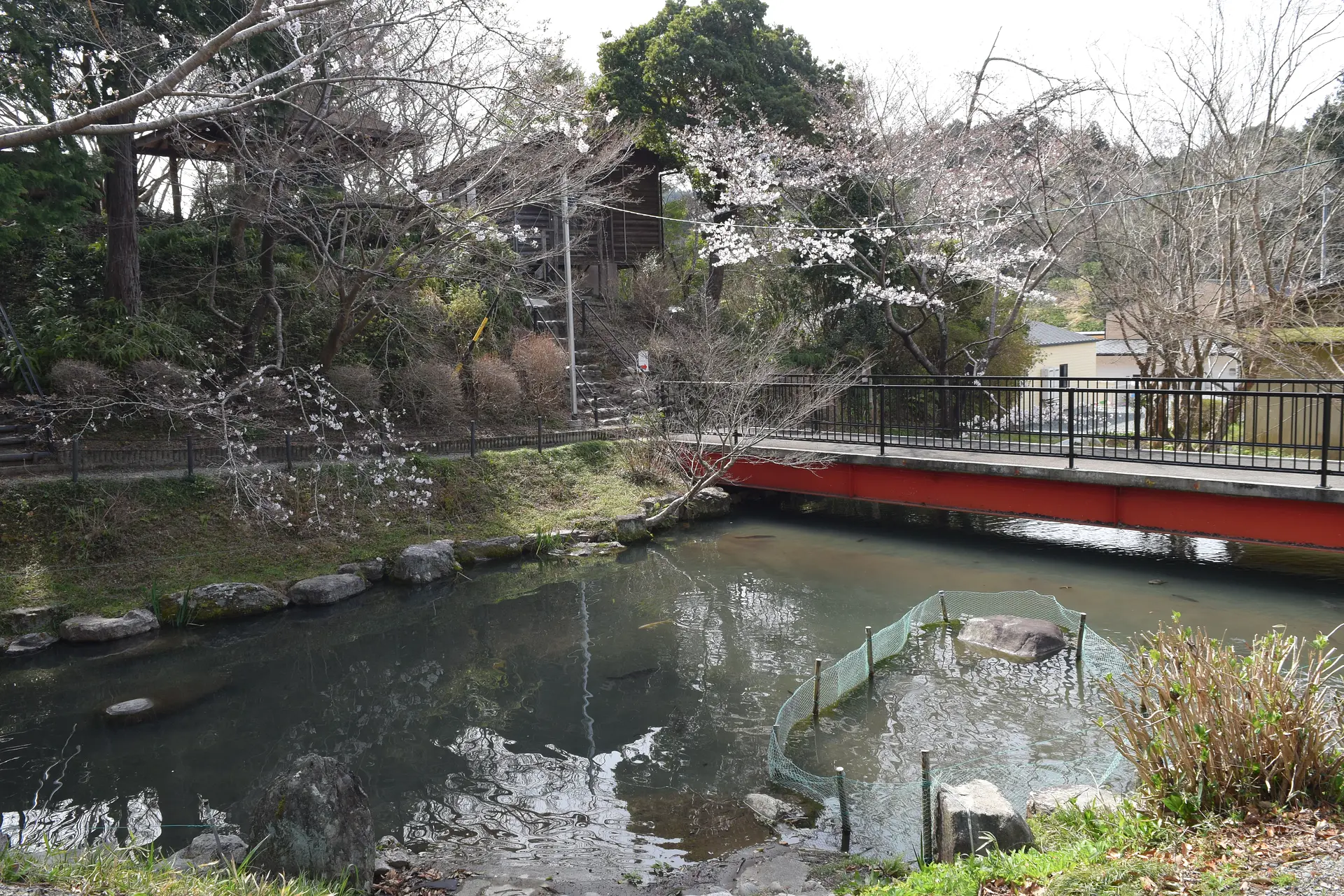 コイの泳ぐ池に架かる橋のそばの桜は5分咲き程度。