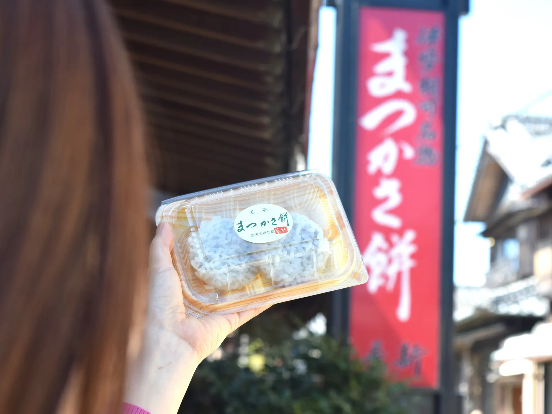 表面に見える米粒の形がまつぼっくりに似ていることから名づけられた名物「まつかさ餅」。江戸時代からお伊勢参り・熊野詣の旅人たちをもてなしてきました。黒糖あんの上品な甘さに、真っ白な歯切れのよい餅は一度食べたら忘れられない味と、ファンも多くいます。