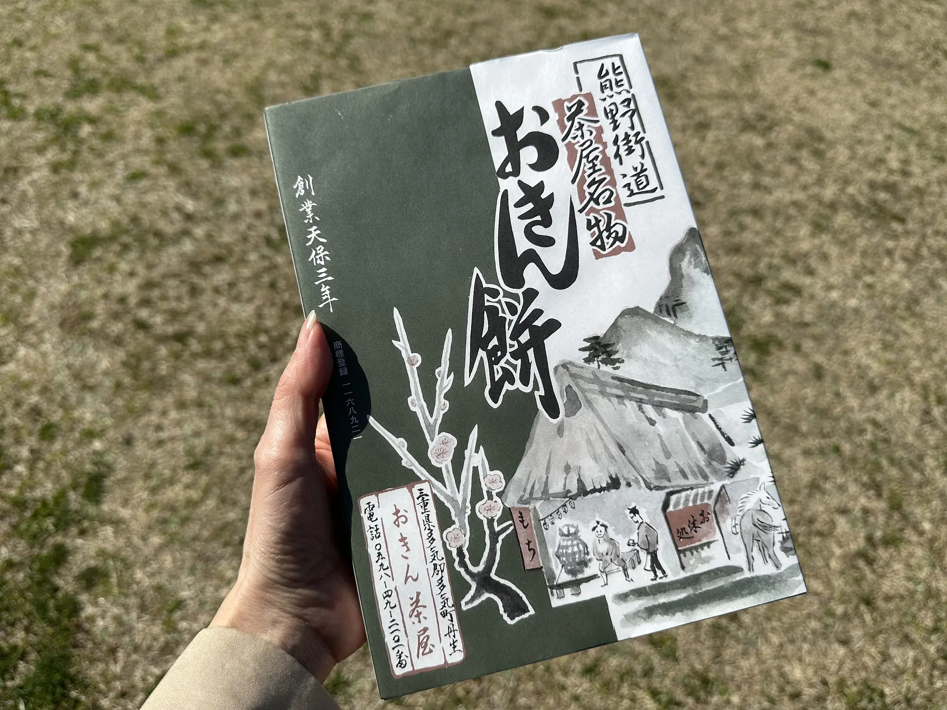 ヨモギの香りと絹肌のような柔らかいお餅の舌触りのお餅は、熊野街道沿いの茶屋として古くから旅人の疲れを癒していました。「おきん」という名前のおばあさんが作っていたため、「おきん餅」と呼ばれるようになったそうです。