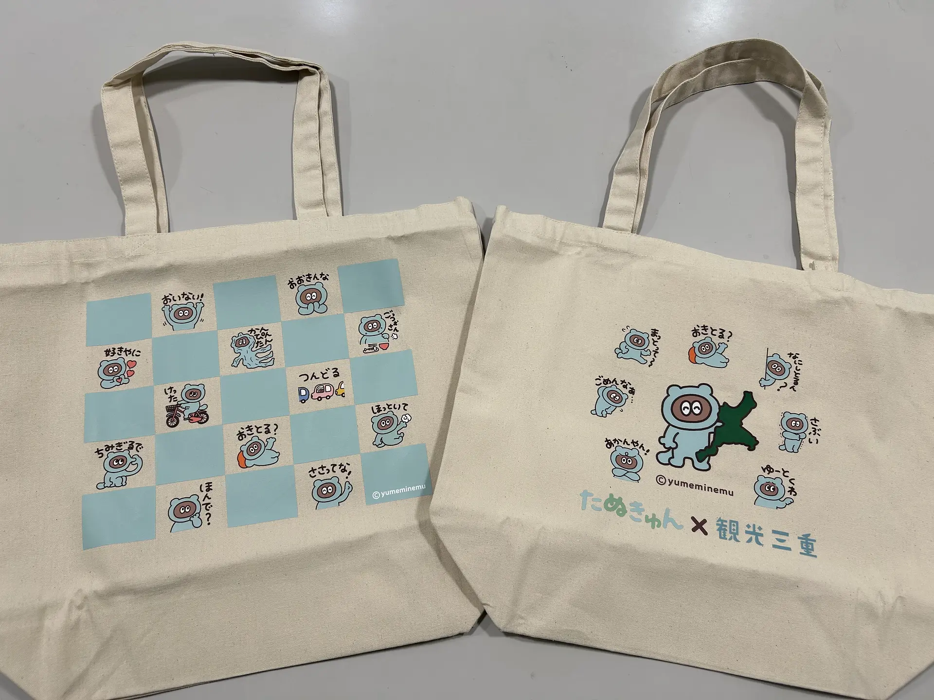 みえの国観光大使の夢眠(ゆめみ)ねむさんがプロデュースするキャラクター「たぬきゅん」と「観光三重」がコラボした、日常生活で使える三重弁を可愛く表現しているイラストがデザインの限定トートバッグです。