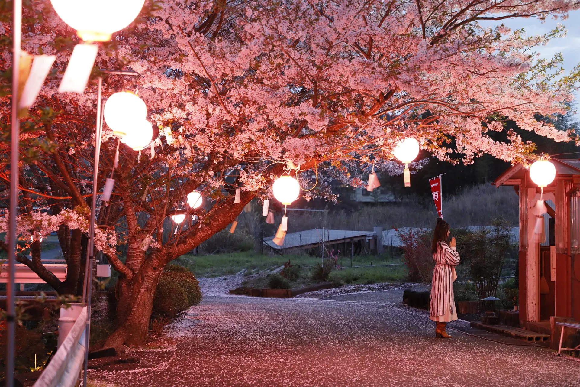 国道42号からも見える約50mの桜並木「茶屋一願地蔵(ちゃやいちがんじぞう)桜道」は、桜の季節に合わせてピンク色の提灯が飾られます。ライトアップされた夜桜見物はデートにもおすすめしたいスポット。