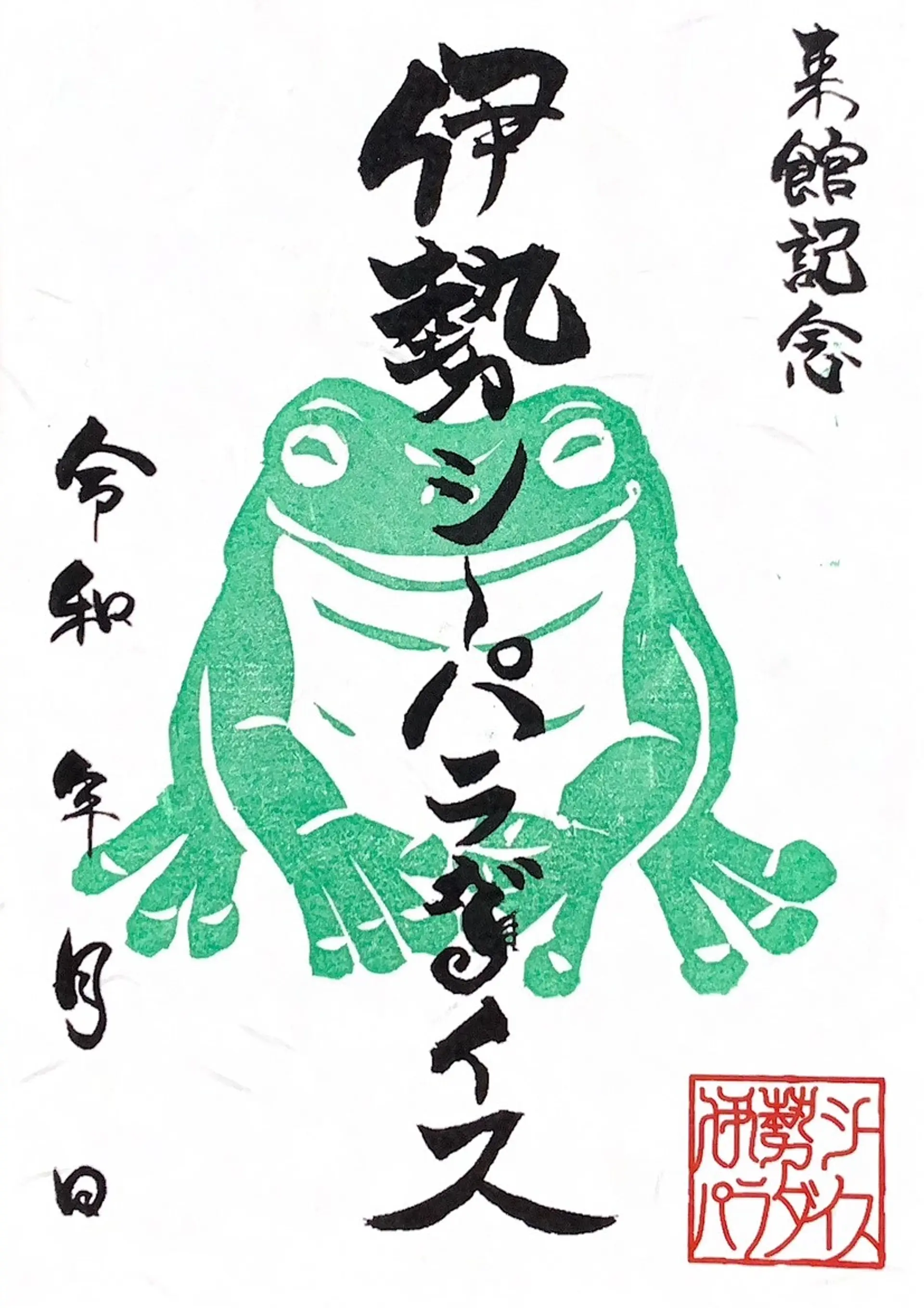 伊勢シーパラダイスでは、日本に生息している二ホンアマガエルや、海外に生息するヤドクガエル類、樹工性のカエル類など多種多様なカエルが展示されています。にっこり笑ったような表情の緑のカエルが何とも愛らしい魚朱印にデザインされています。