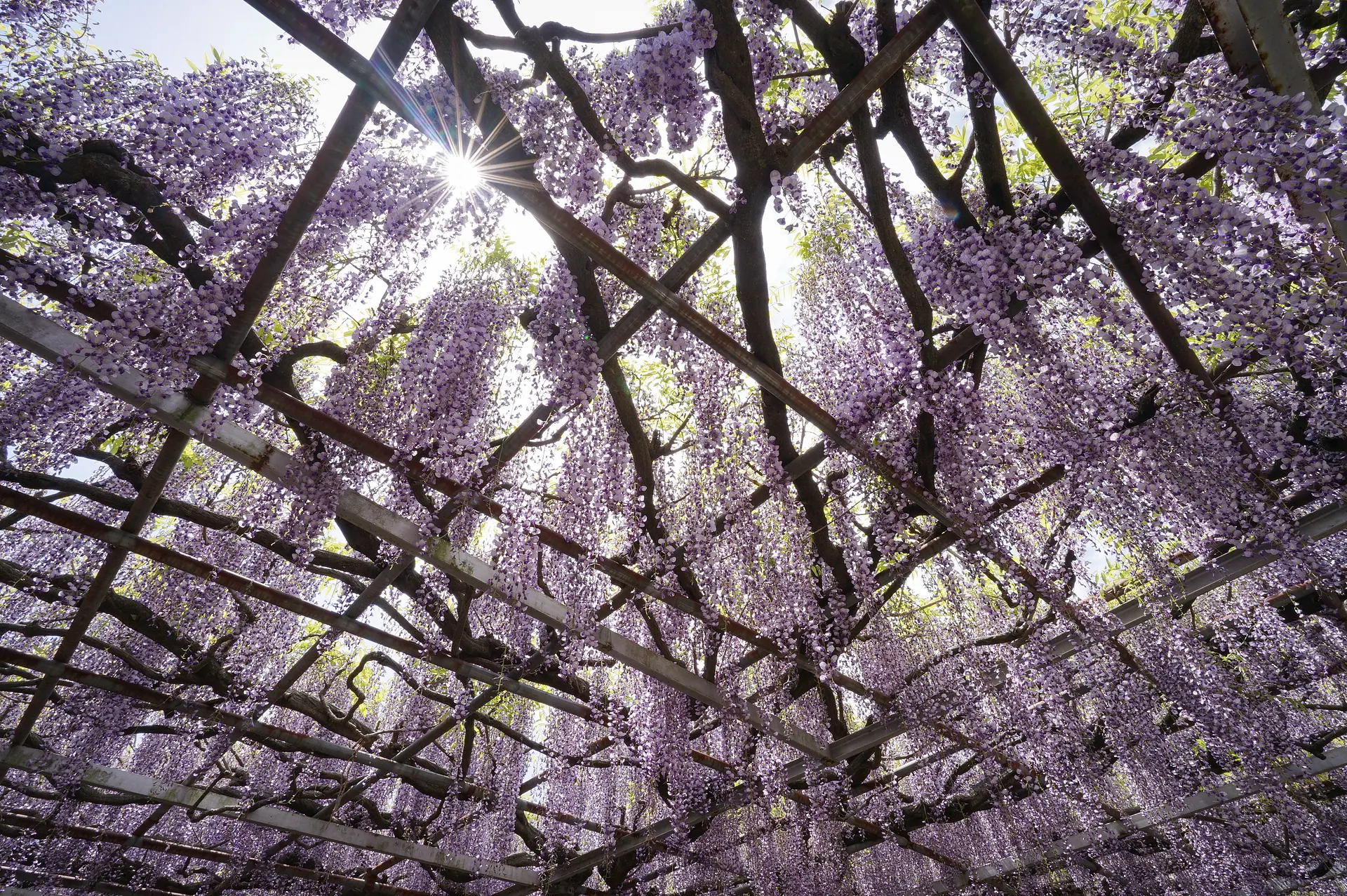 また、下から空を仰ぐように眺めると、シャンデリアのような藤の花が楽しめます◎
