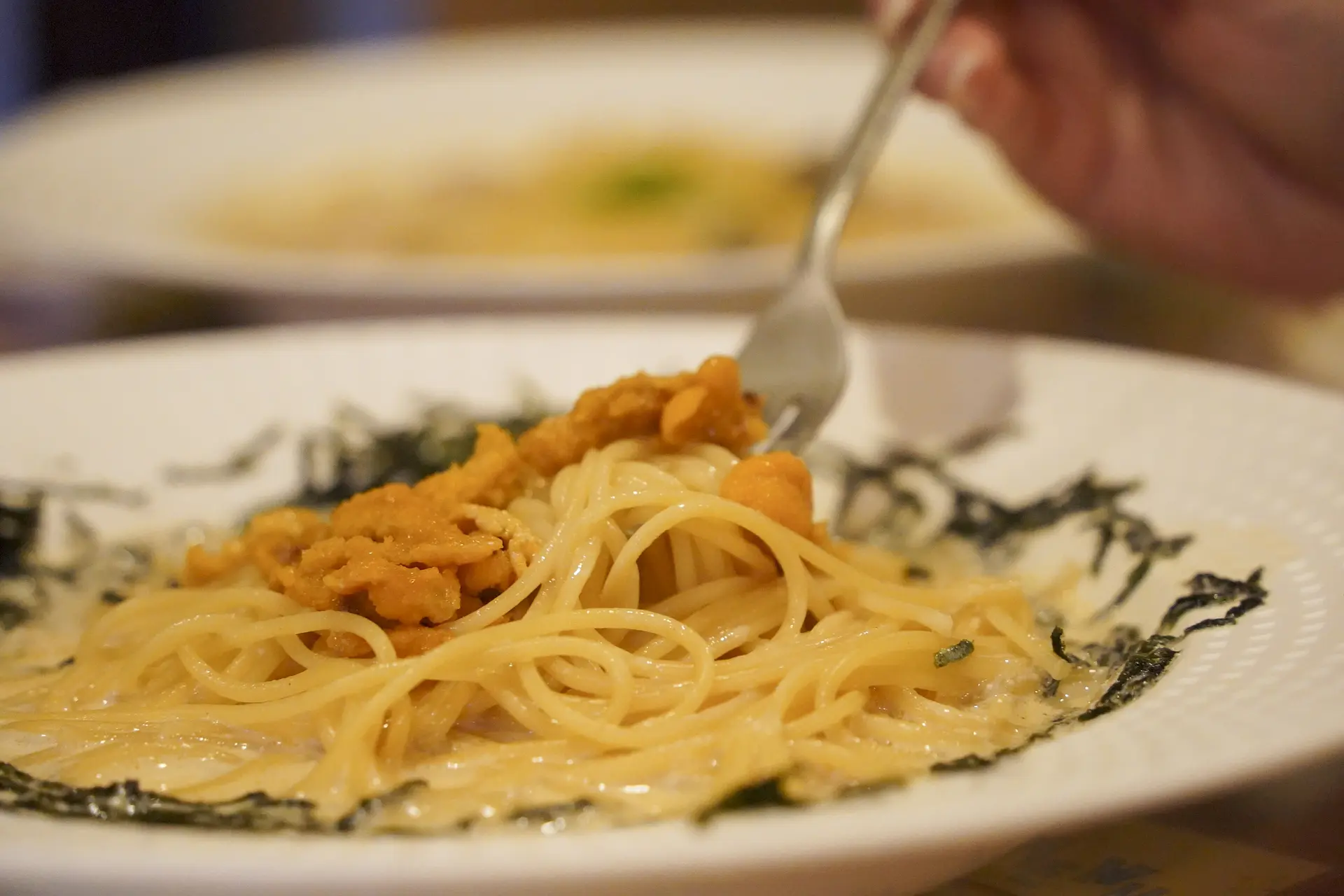 口の中でとろける濃厚なウニ。パスタとの相性も抜群なウニは、食べても食べてもまだあります。なんと贅沢!コクのあるクリーミーなソースに、刻み海苔の磯の香りが良いアクセントです。