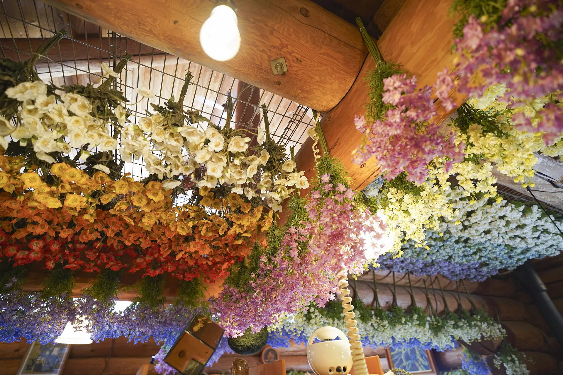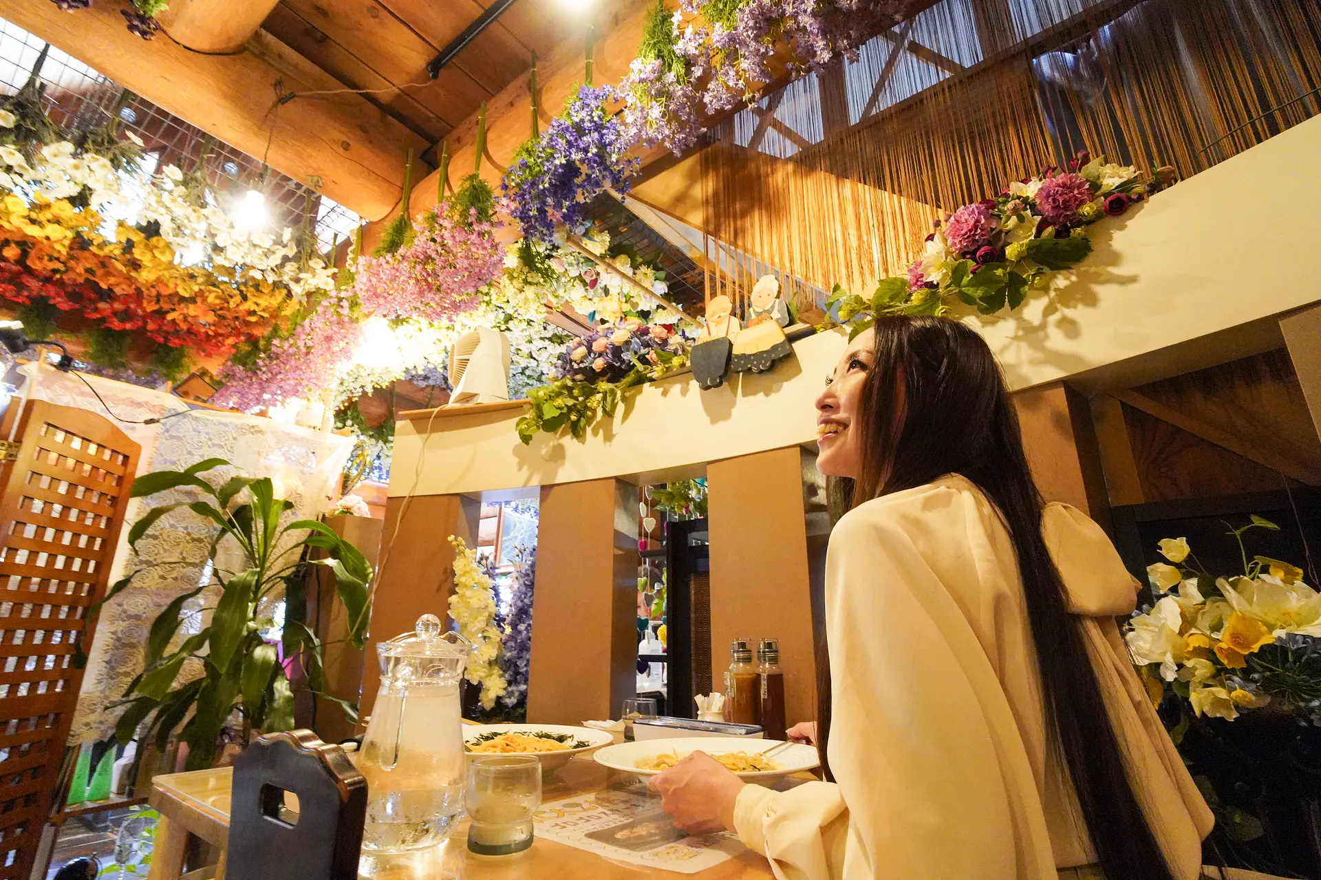 店内に入ると目に飛び込んでくる、たくさんのお花。天井に飾られた色とりどりのアートフラワーを眺めながら、パスタやハンバーグなどおいしい料理やドリンクを楽しめます。