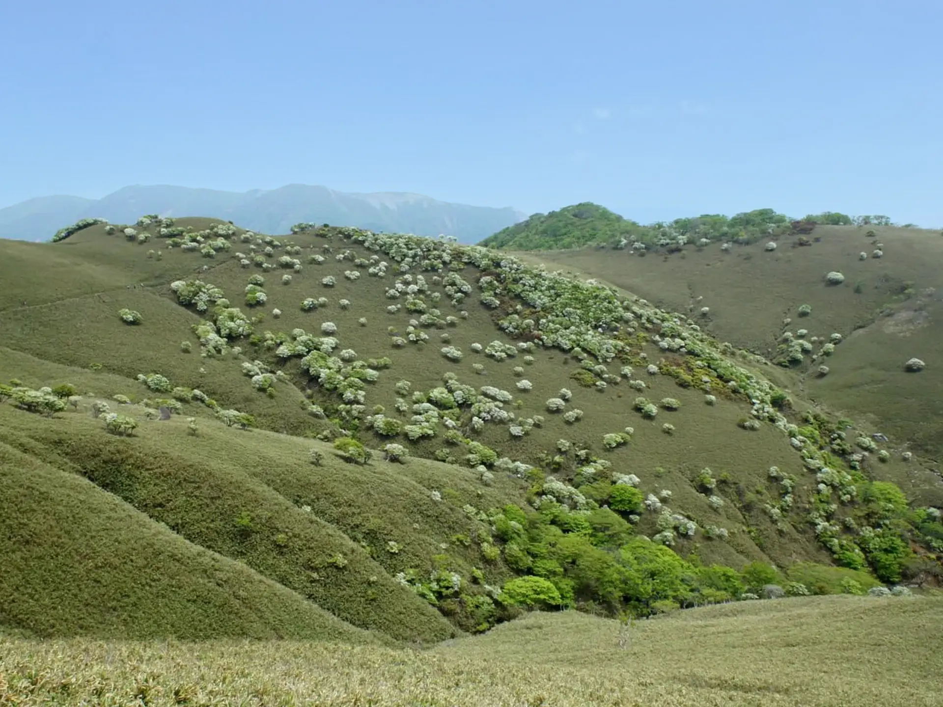 その白いヒツジの大群の正体は、「シロヤシオ」というツツジ科の花です。 山の斜面や岩場に生息しています。5〜6月にかけて、枝先の花芽から新葉とともに1〜2個の白い花が咲きます。