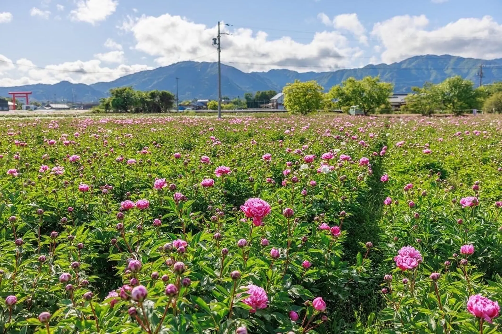 また、シャクヤク畑の近くにある、椿大神社の朱色の大鳥居とシャクヤクとのショットや、鈴鹿山脈を背景にシャクヤクの花を撮影するのも素敵ですよ。