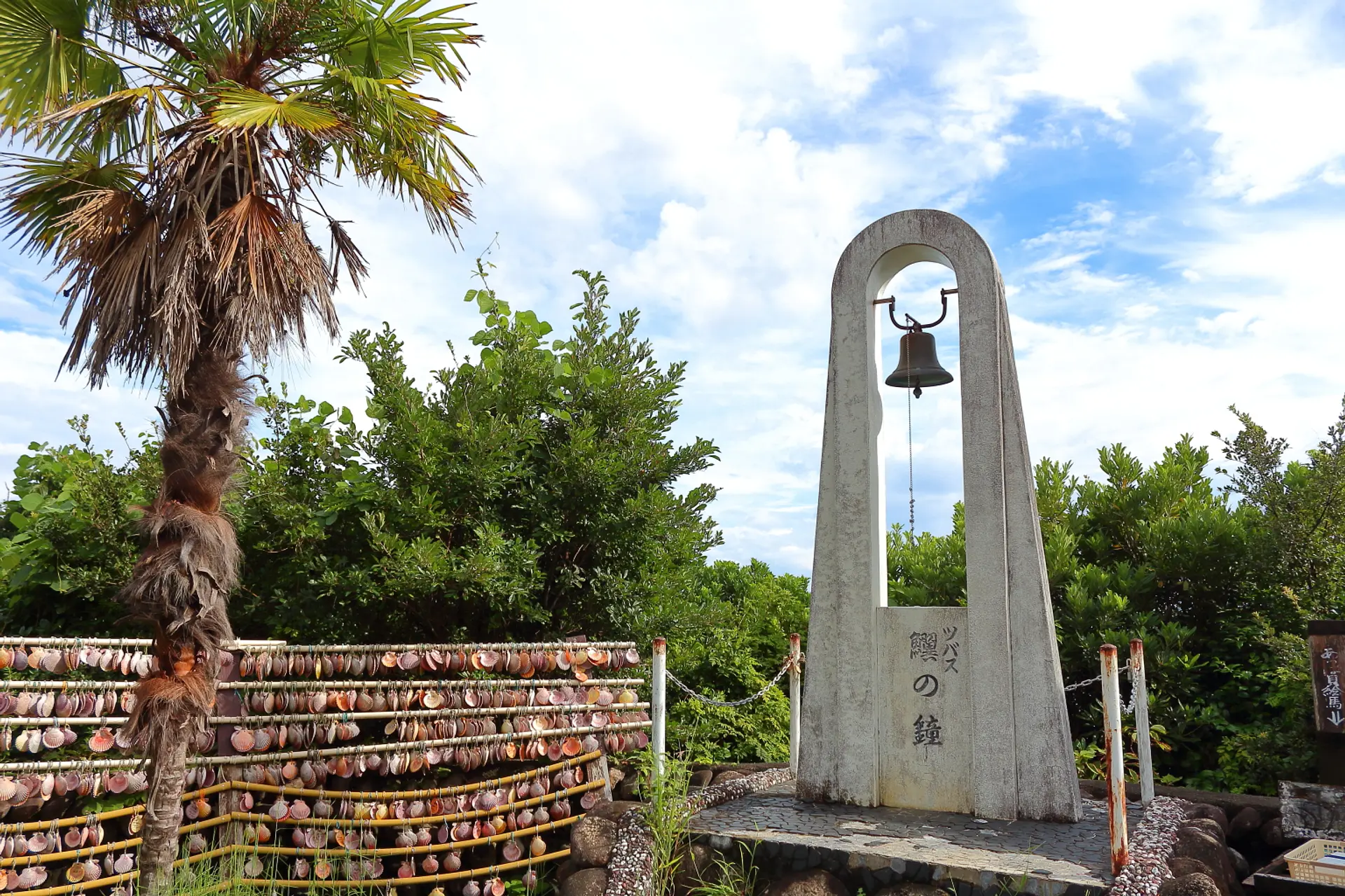 鳴らすと出世と幸運に恵まれるという鐘とともに、願いを綴った檜扇貝の絵馬が並びます。
