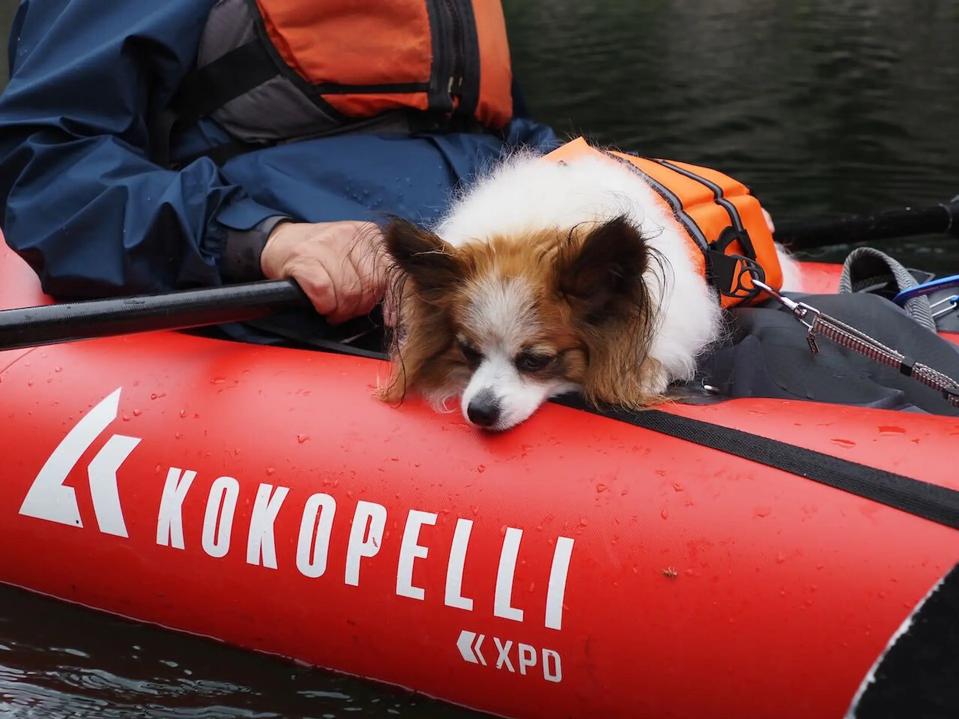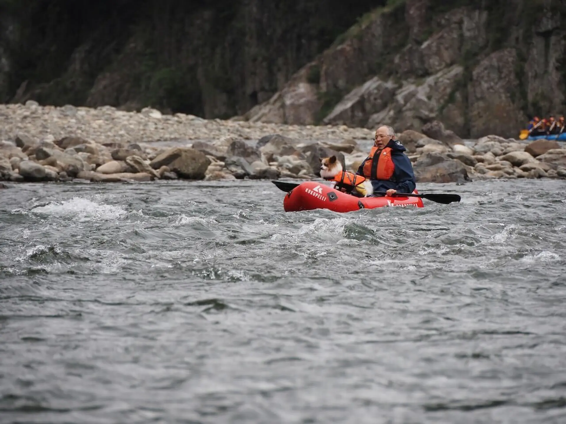 半日ツアーのコースは、流れがゆったりなところが多い初心者コース。怖がりなこうくんでもパックラフトの先端に立って楽しめました。好奇心旺盛なパピヨンのそらちゃんは、序盤からパックラフトの先端に立ち、慣れてきた頃には寛いでいる素振りも。