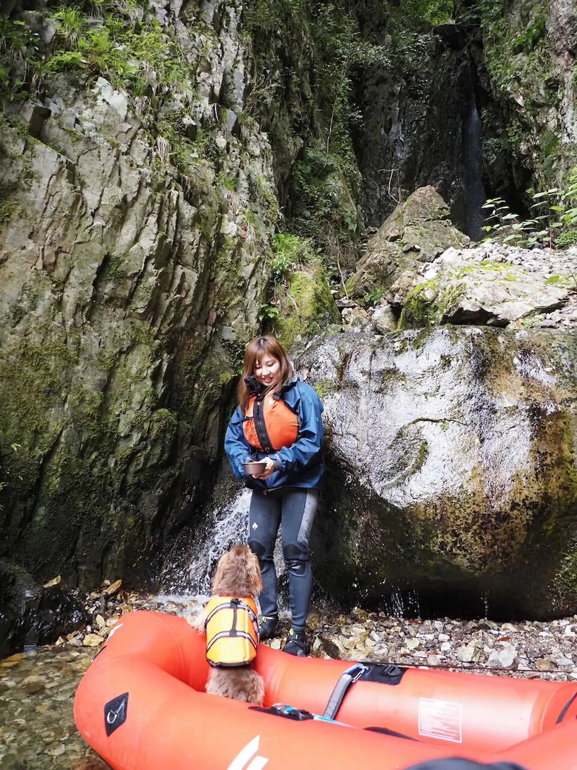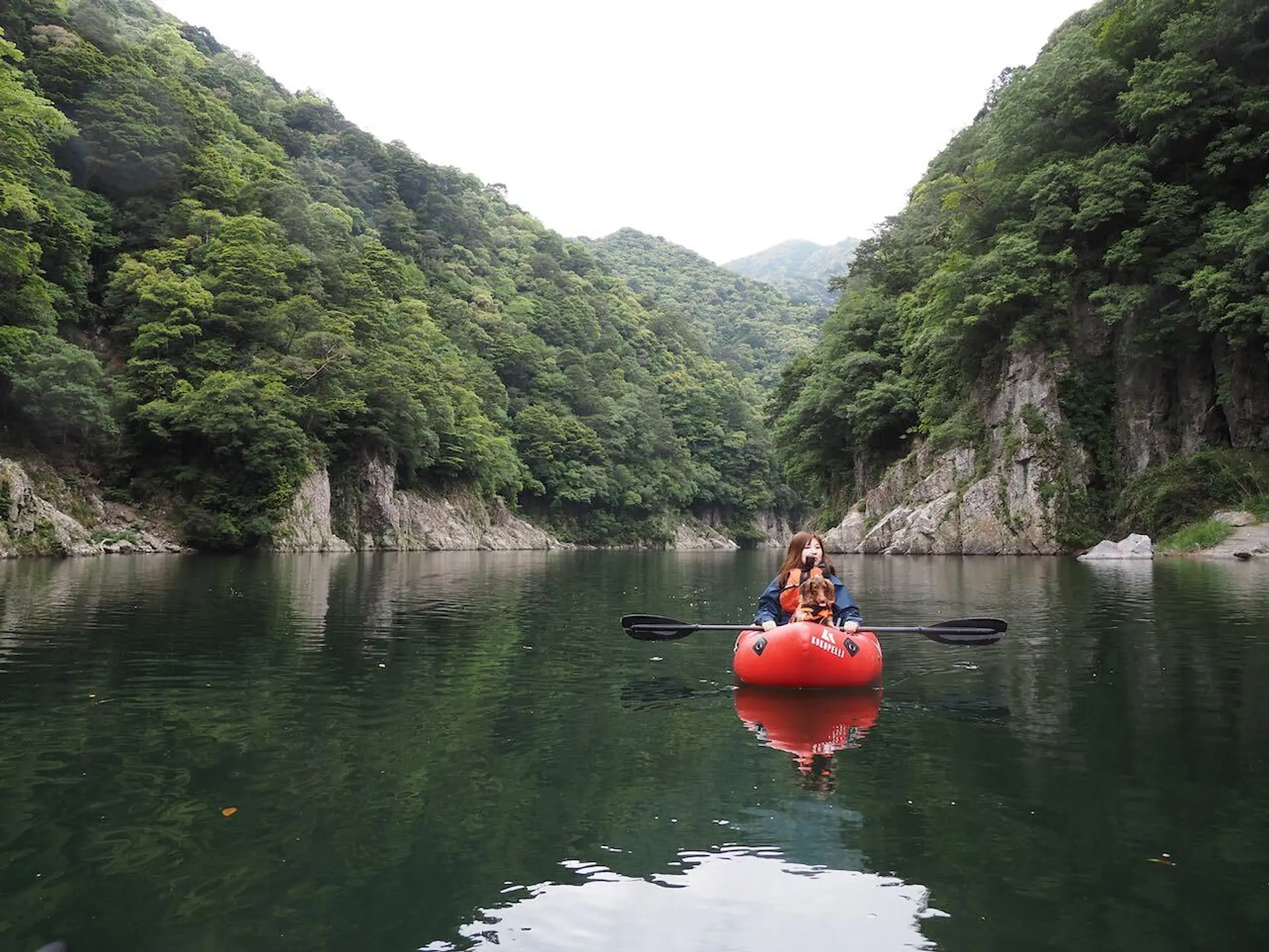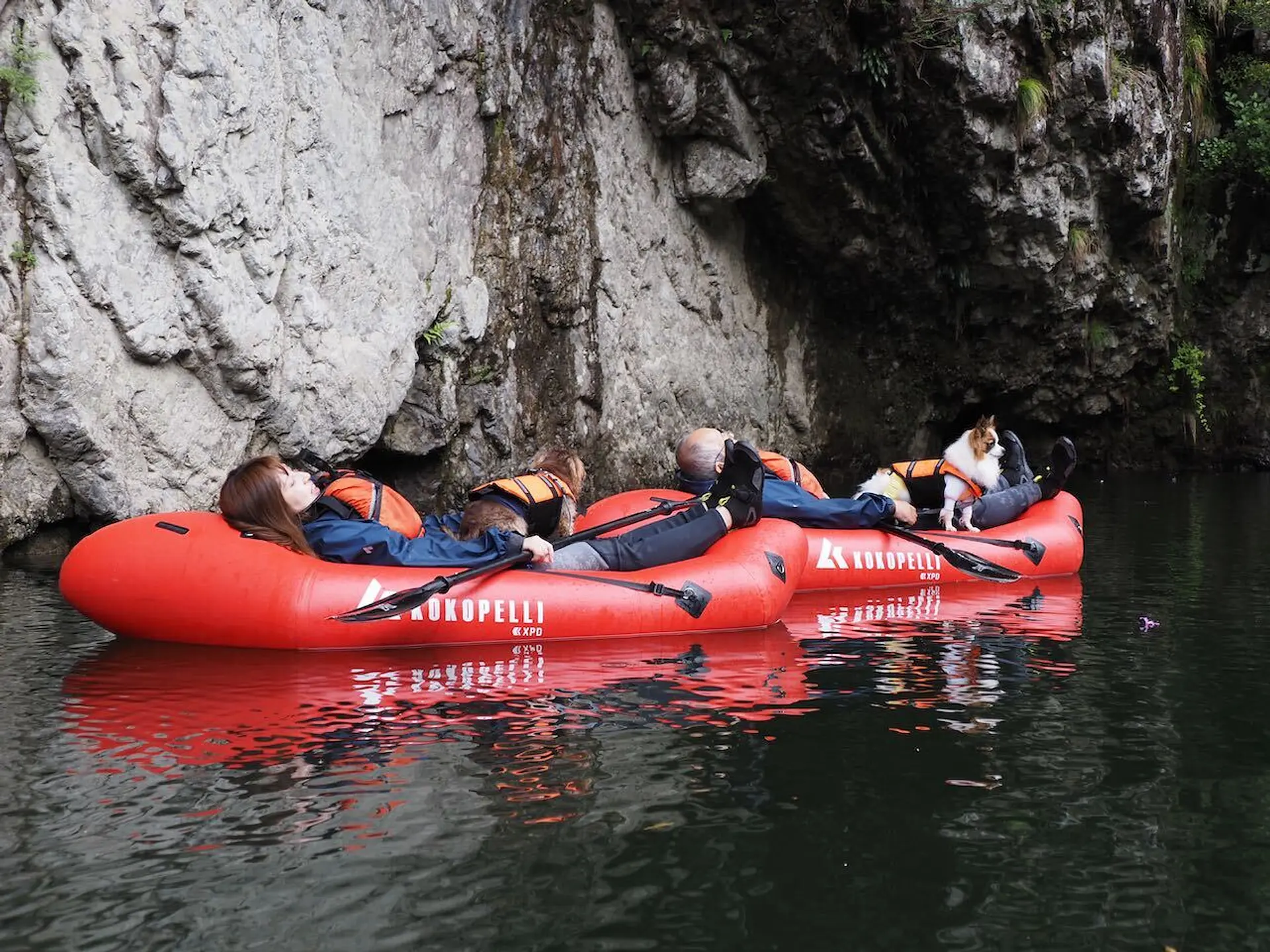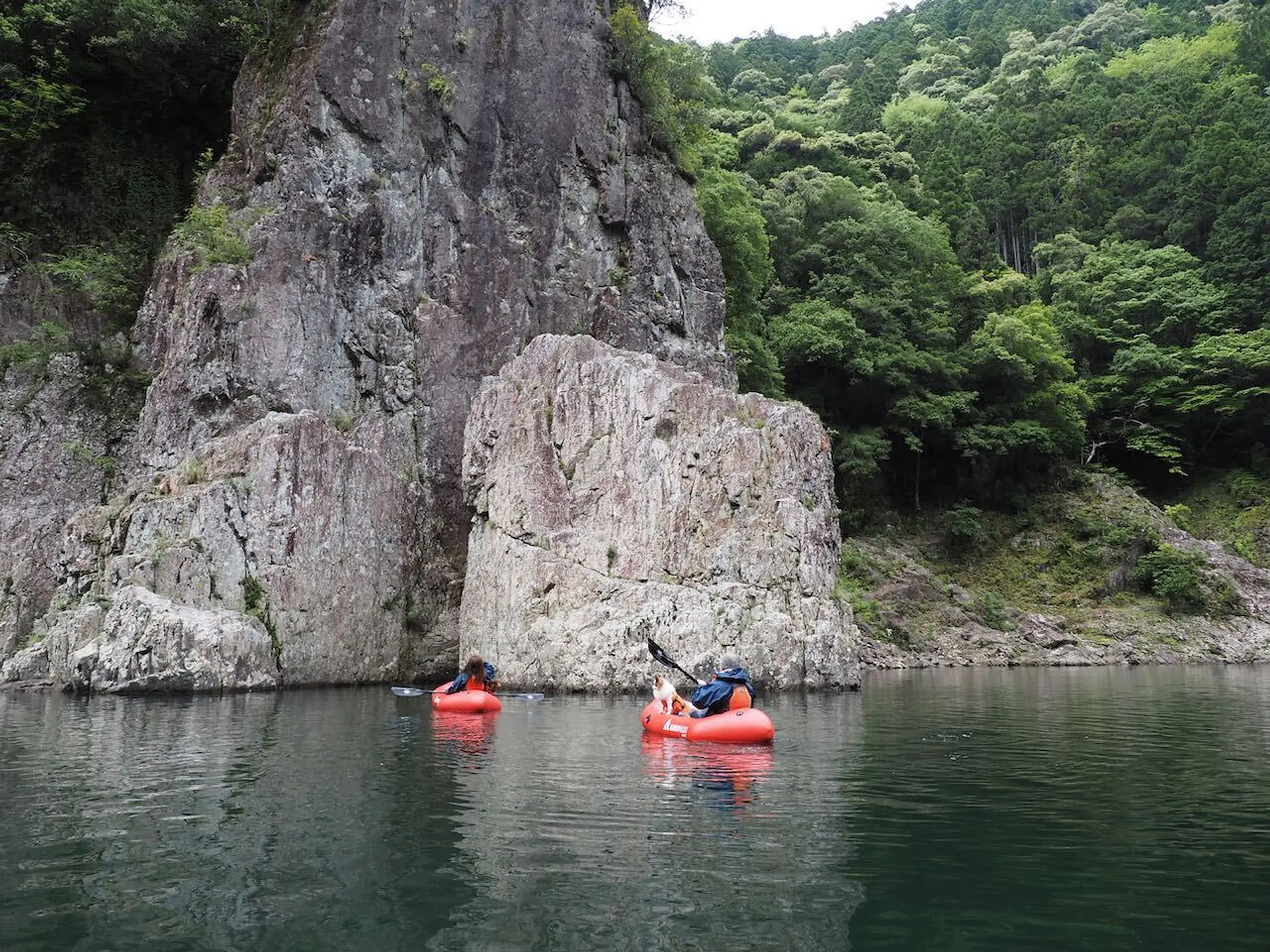 流れが穏やかなところではわんちゃんをお腹の上に乗せて、パックラフトの上で仰向けに寝転ぶことも。断崖絶壁を下から見上げて、鳥のさえずりと川の流れる音しか聞こえないという日常では味わえない経験ができます。