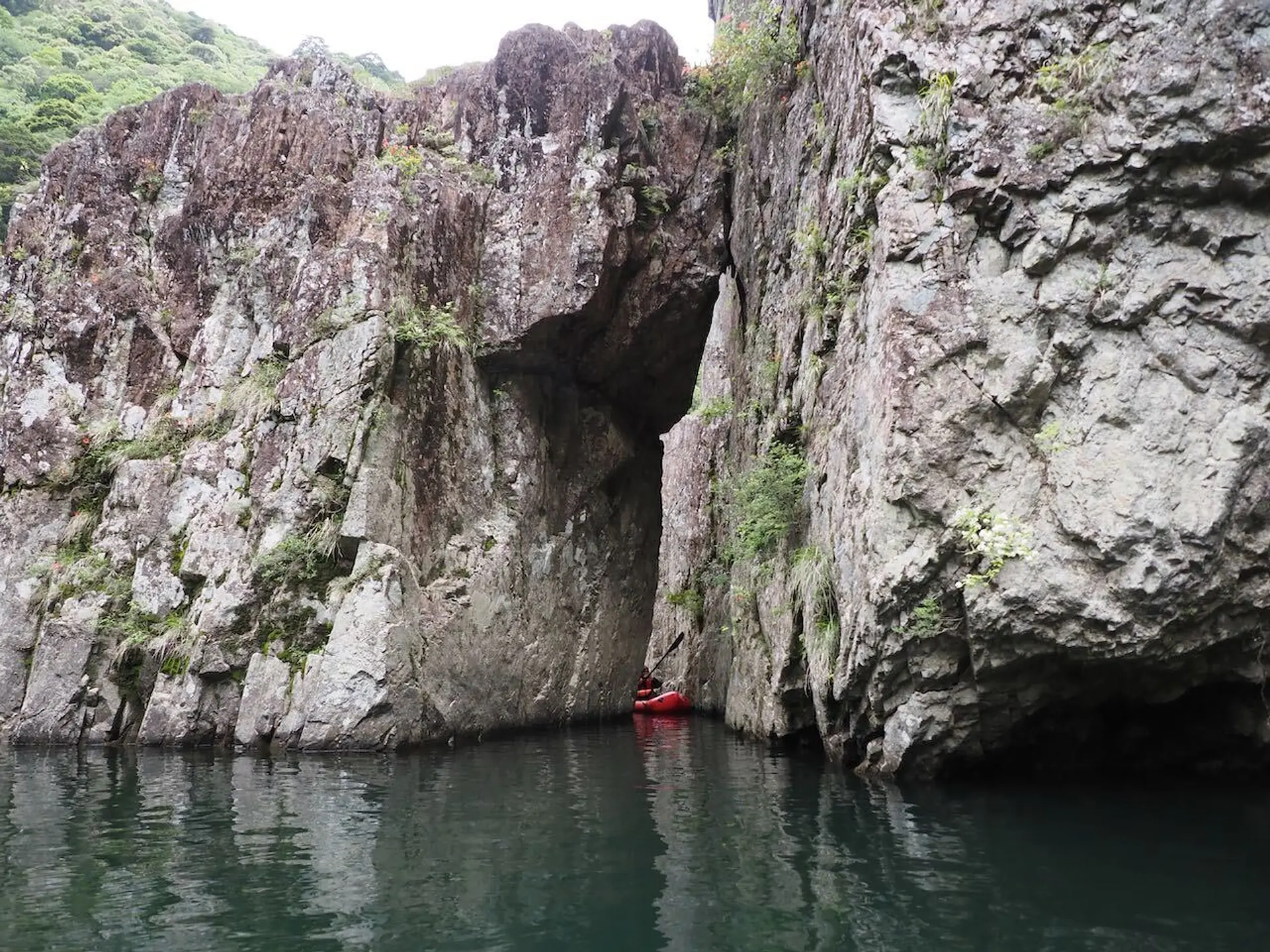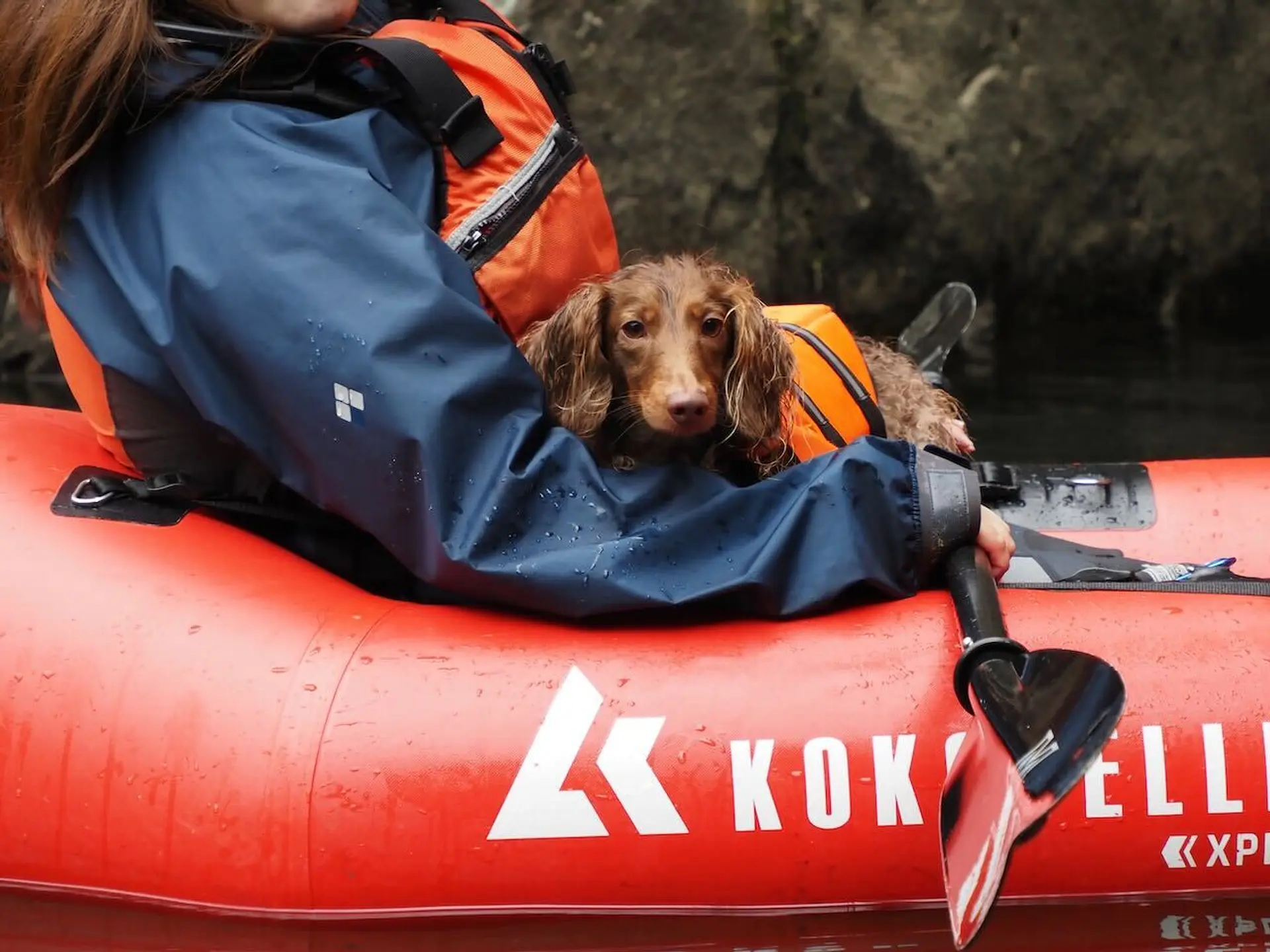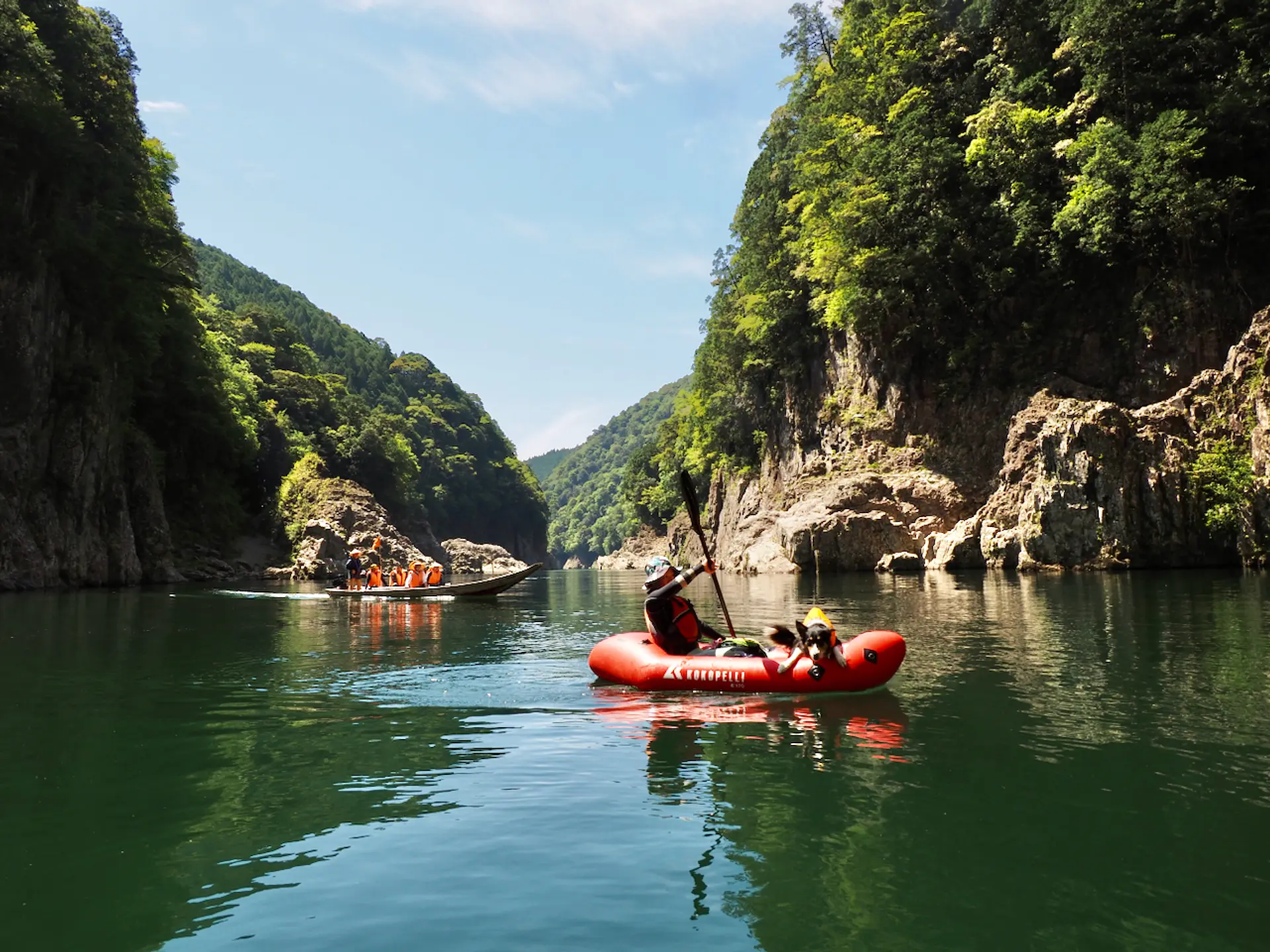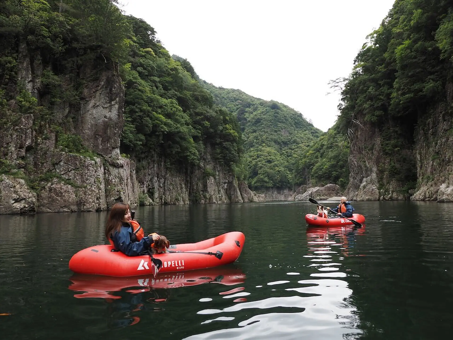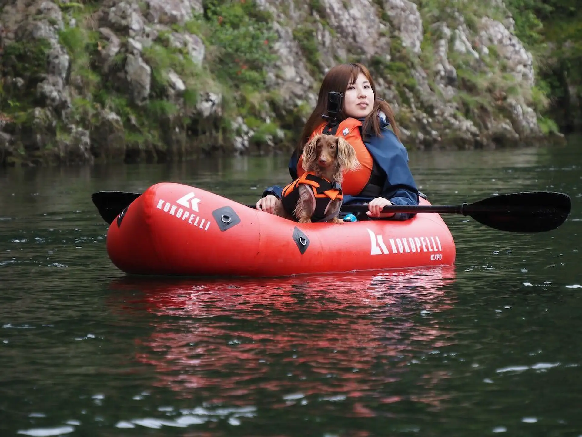 流れが穏やかなところではわんちゃんをお腹の上に乗せて、パックラフトの上で仰向けに寝転ぶことも。断崖絶壁を下から見上げて、鳥のさえずりと川の流れる音しか聞こえないという日常では味わえない経験ができます。