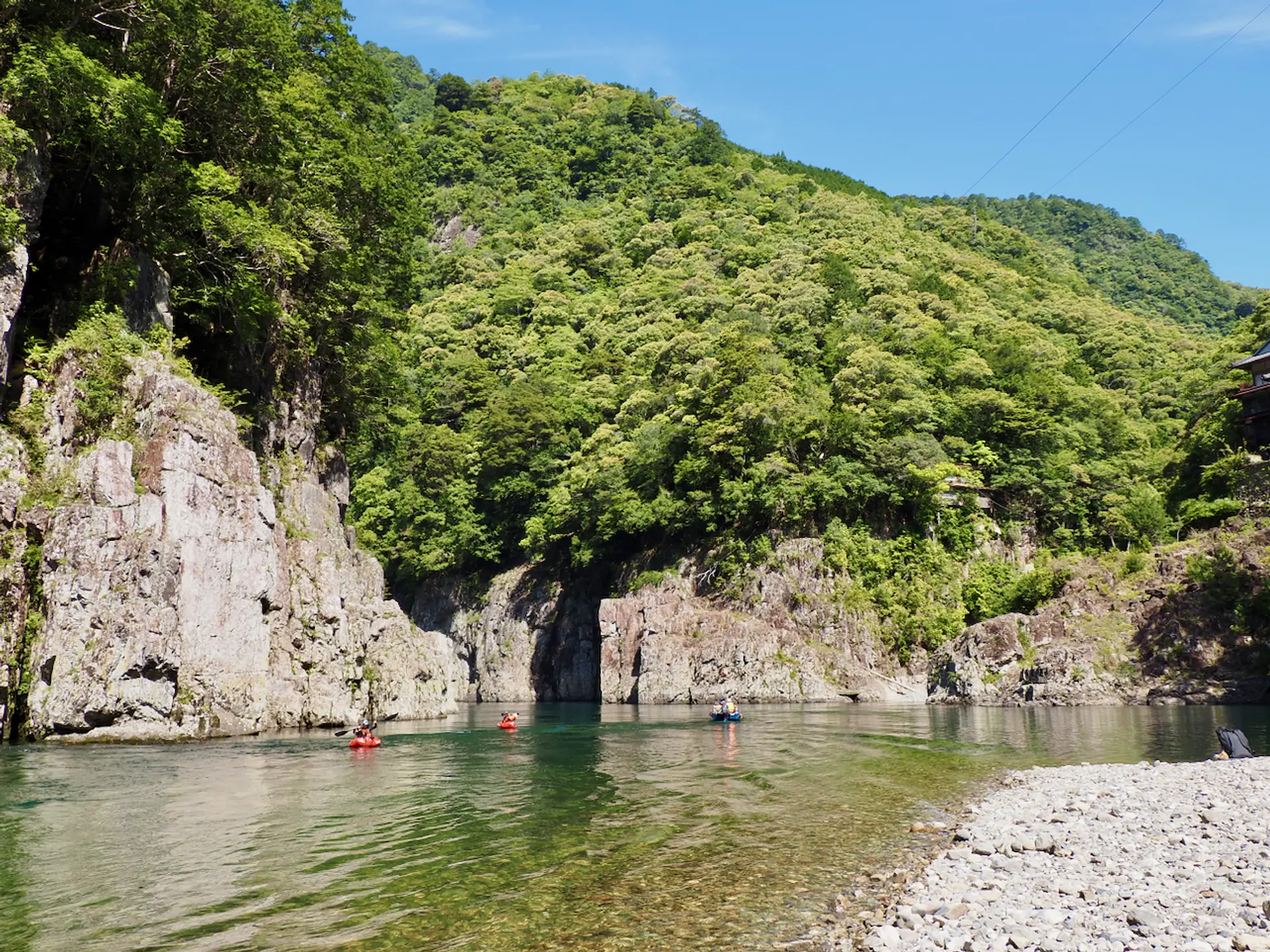 アクティビティ初心者には、まずは瀞峡パックラフト半日ツアーがおすすめです。最初の練習時間では「瀞ホテル」の前のほぼ流れがない三県境ゾーンで、パックラフトの操縦に慣れるところから始められます。思うように進めるようになったら、流れが少し早いゾーンで練習をして、全長3キロほどの川下りスタートです!