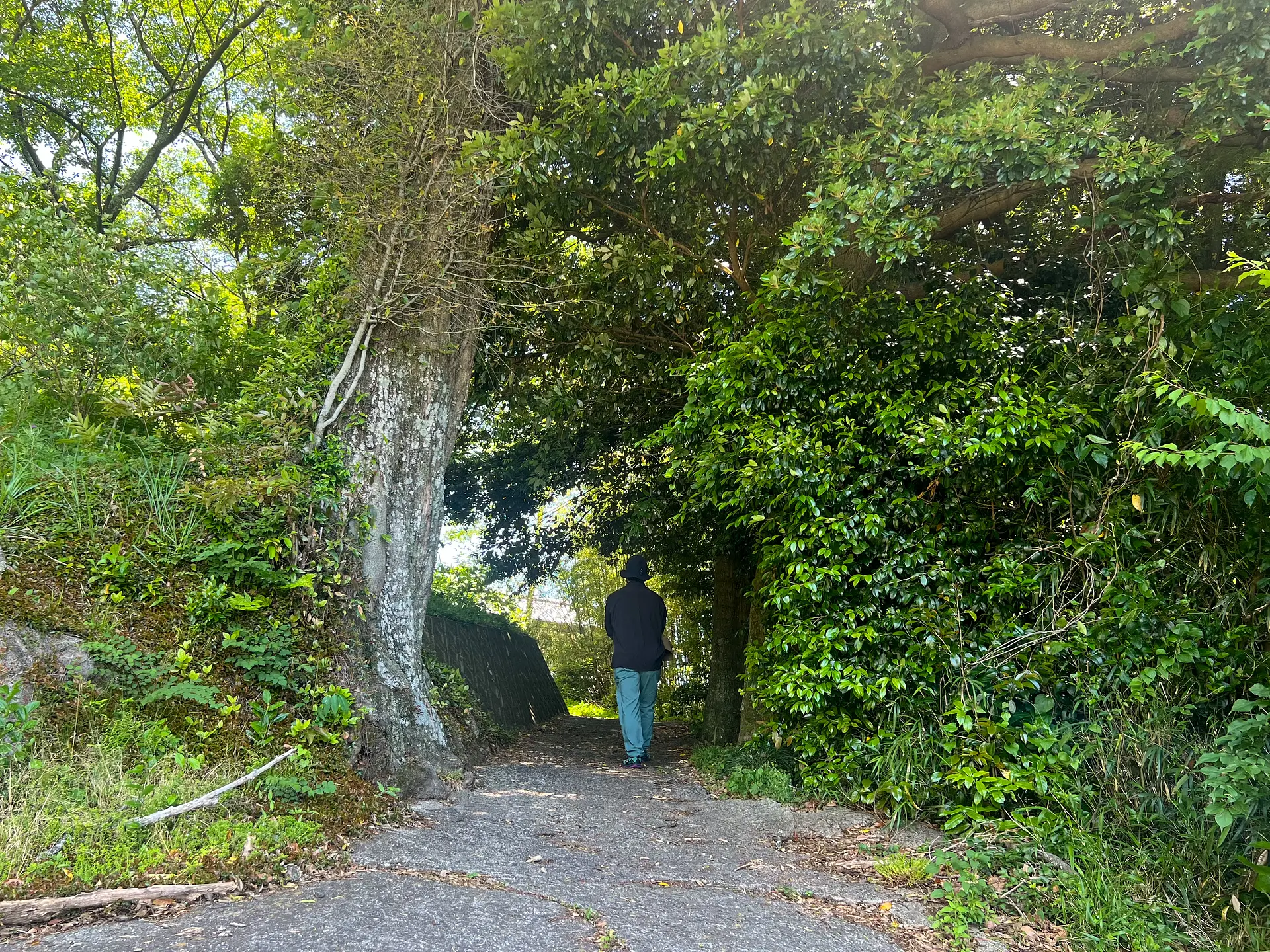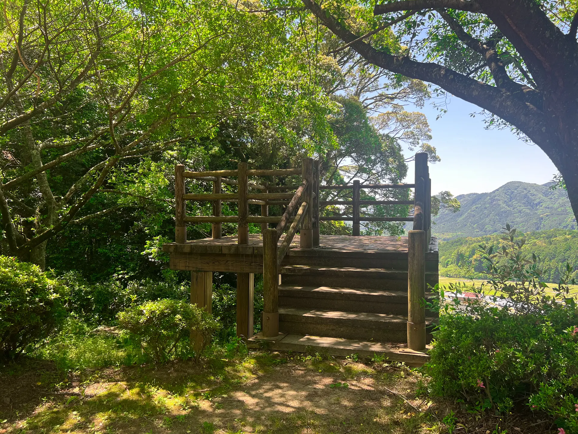 ⑤坂を登っていくと分岐があるので、右へ曲がります。そのまま道なりをしばらく進んでいくと展望台が見えてきます。さらに進み、木のトンネルをくぐった左手に階段があるので登ります。