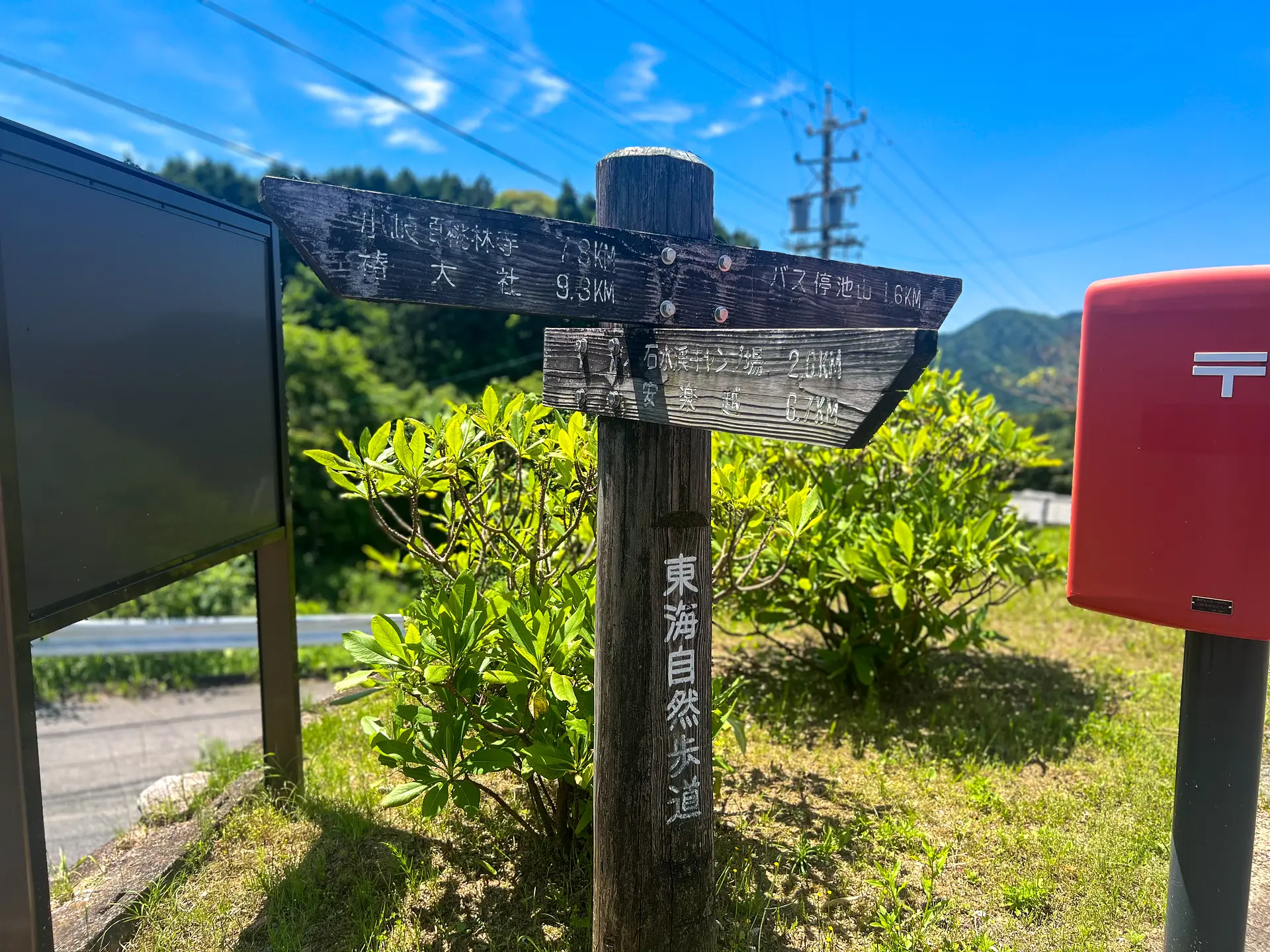 ②分岐に到着します。分岐の場所に東海自然歩道の案内看板があります。「石水渓キャンプ場・安楽越」の矢印方向に向かって道路を進みます。