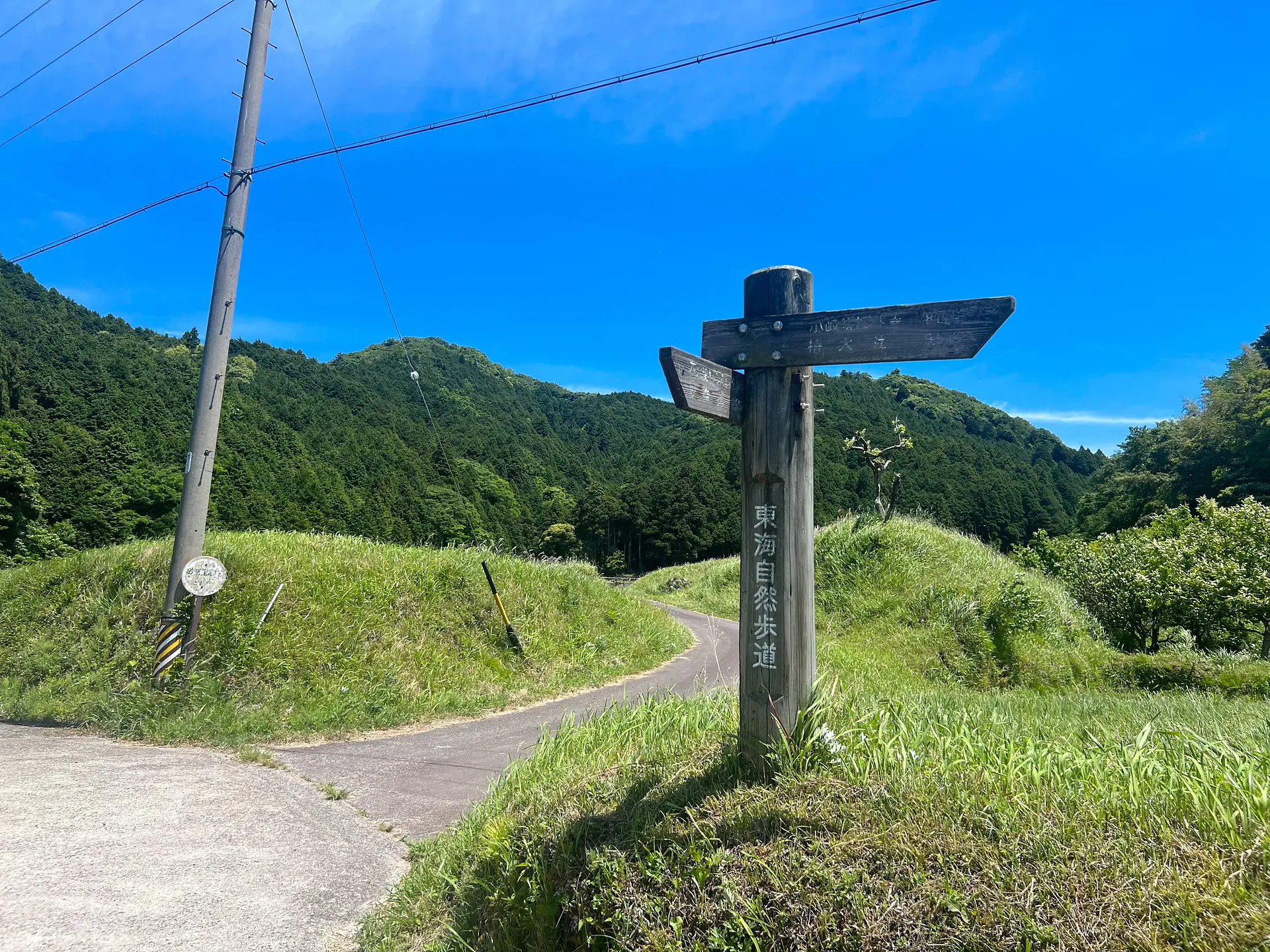 ④展望台へはさらに道を進み、東海自然歩道の案内看板がある分岐に到着します。看板がある方向(右)へ進みます。