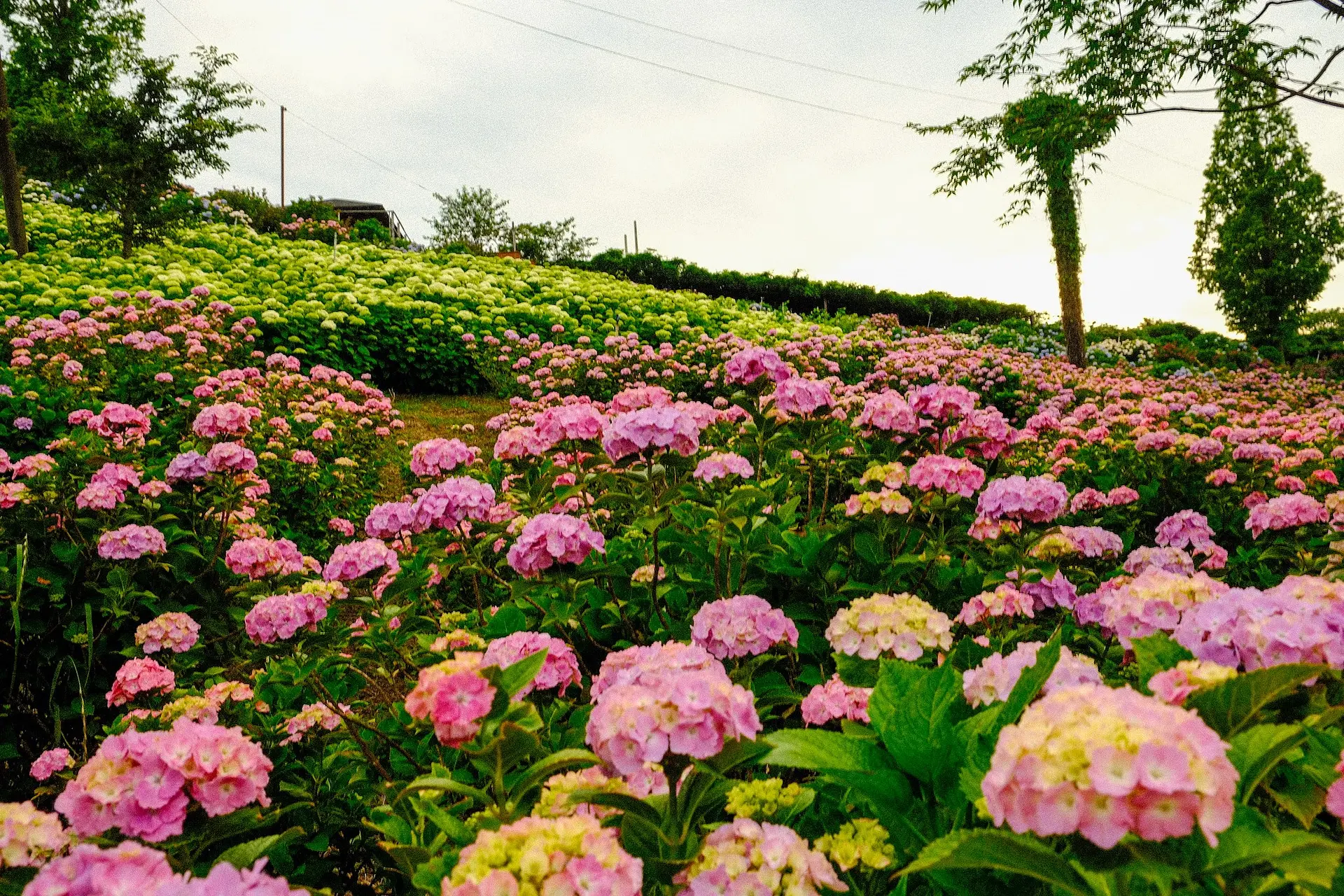 三重県津市にある「かざはやの里」では「2024あじさいまつり」を開催中。アジサイの絶景が圧巻の園内では、色とりどりのアジサイの花が徐々に色を深め、美しいアジサイが観賞できる「美頃100%」まであと少しとなりました。