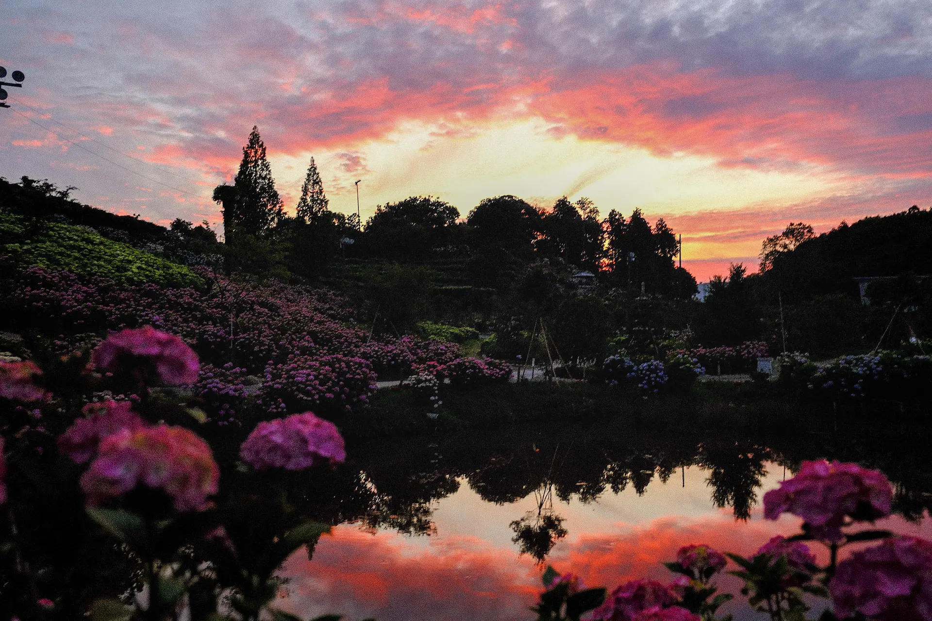 風早池のほとりに咲く45品種77,700株のアジサイは、紫色、ピンク色、水色、青色、濃紫色などの華やかな色合いで、広大な丘陵地に咲き広がる様子は、見事なアジサイのグラデーションをつくりだします。また夕暮れ時には、絵画のような息を呑む美しい絶景が!