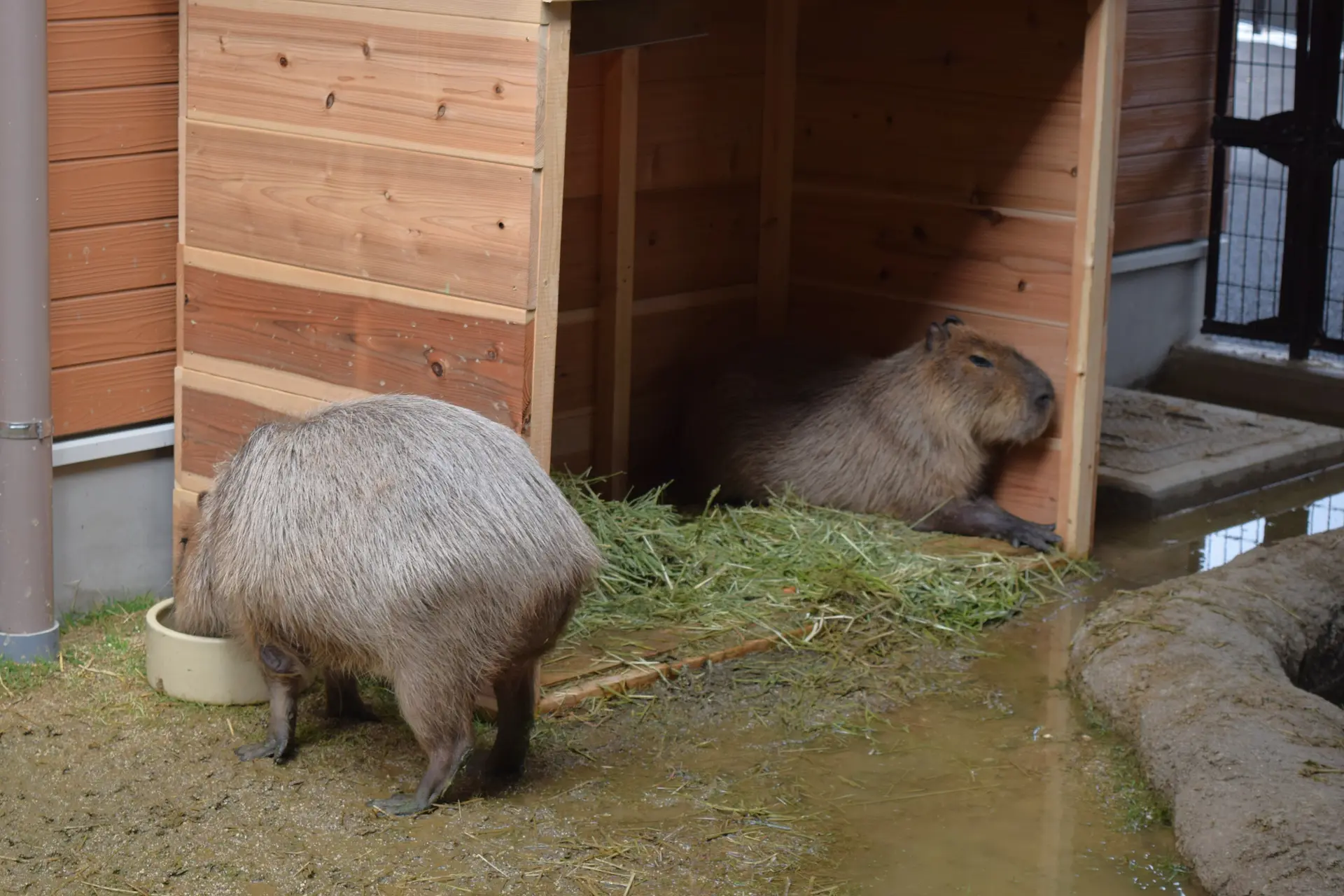 さて、「ごかつら池どうぶつパーク」の入り口ゲートを通ってすぐ出迎えてくれるのが、オオサンショウウオ、カピバラ、ワオキツネザル、カラカル、プレーリードッグ、ミーアキャットがいる「おいないゾーン」です。