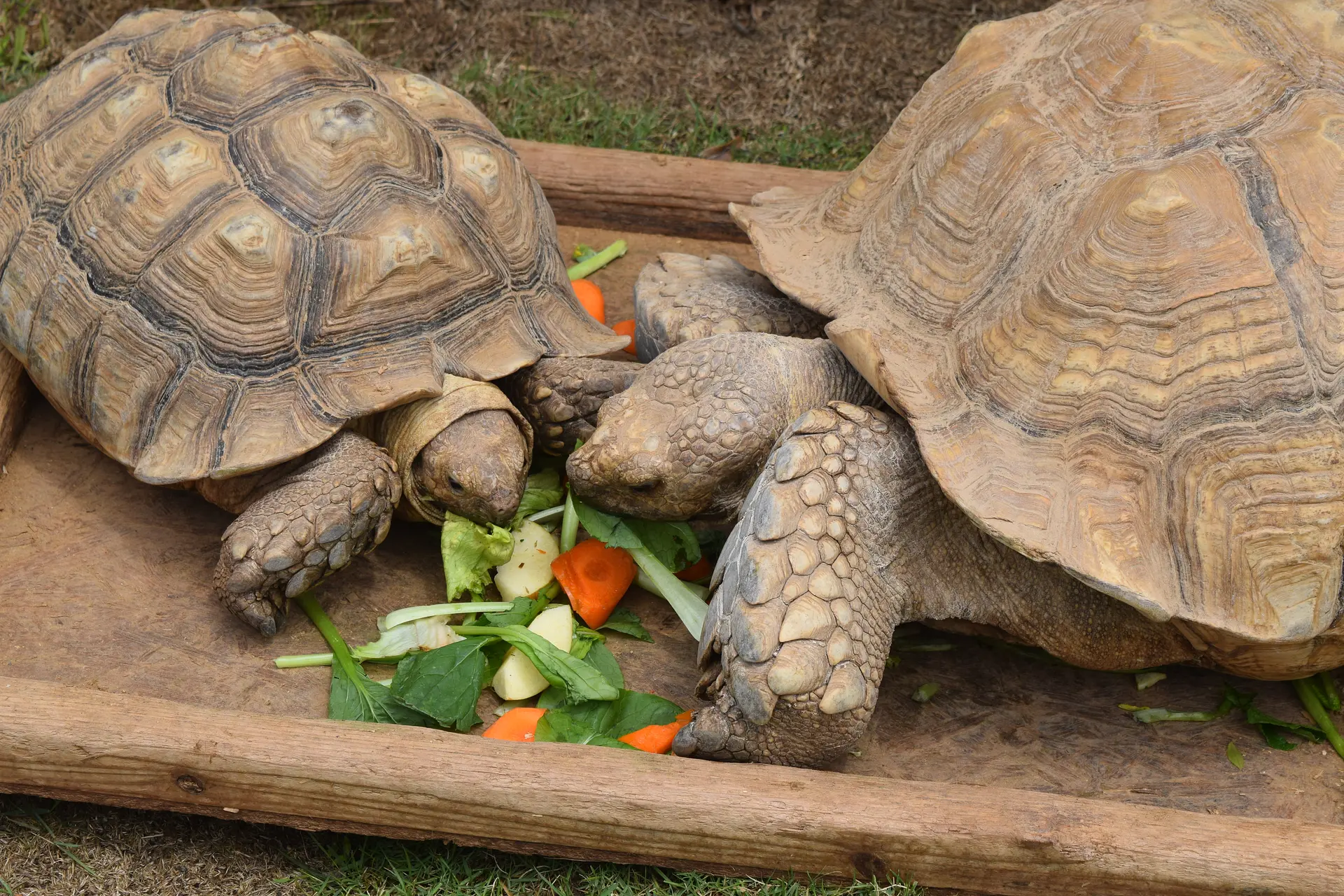 世界で3番目に大きなリクガメである写真のケヅメリクガメは、お天気が良ければ屋外で展示されます。2頭のうち大きい方のデンちゃんは、体重が70~80kgもあるそうです。