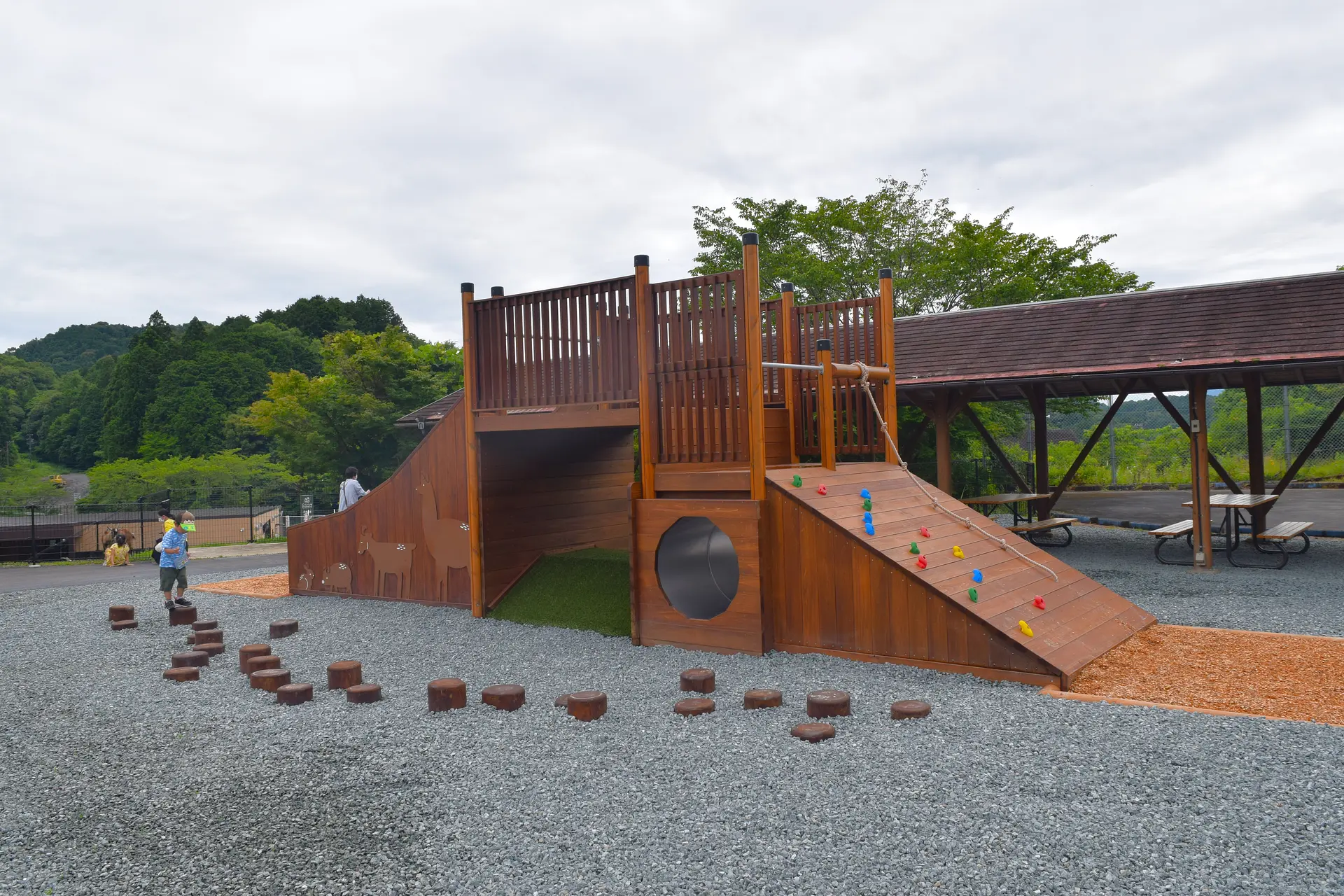「もこもこぞーん」の隣には、小さな子供たちが夢中になる遊具と屋根付きの休憩スペースがあります。ここでもゆっくりと過ごせますよ。