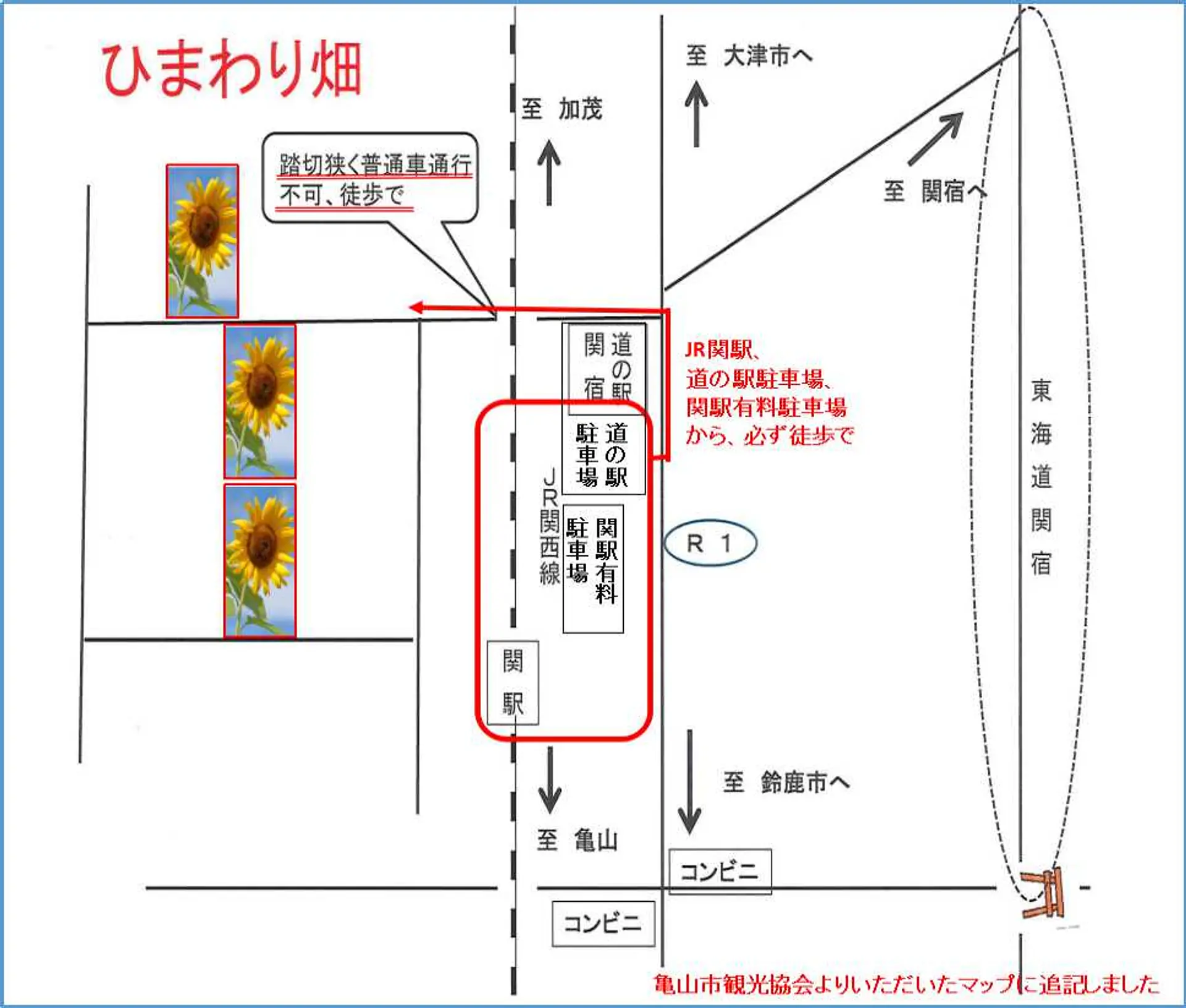 JR関駅南側の向日葵畑、2024年6月下旬に見に行った状況では3面で植栽されているようで、亀山市観光協会よりいただいたマップに追記すると上図のような位置関係ですが、長期間楽しめるように開花時期がずれるように調整して、植栽してくださっています。