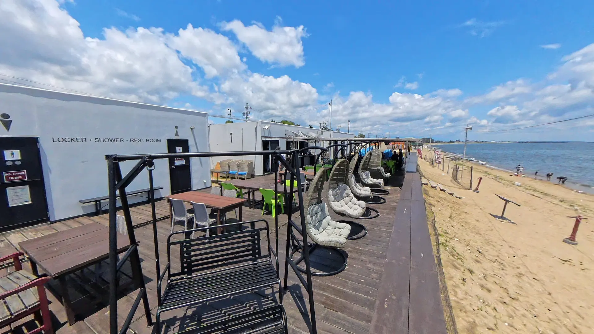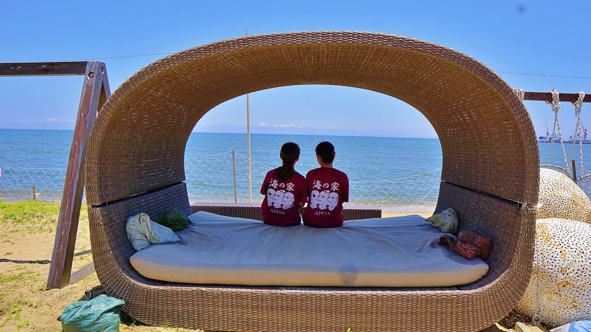 白い建物にウッドデッキ、ハンギングチェアなどを海岸沿いに備える海の家APOAは、居るだけでリゾート気分が味わえます。