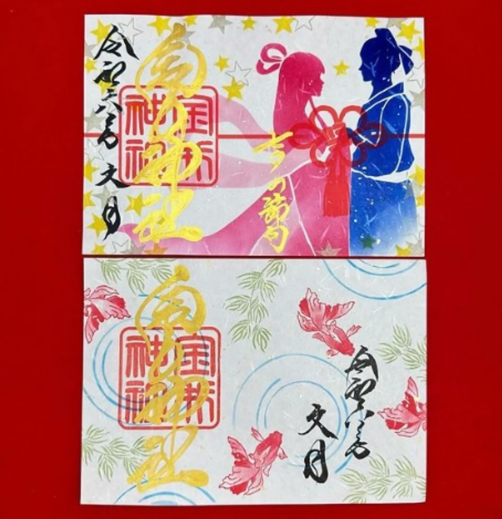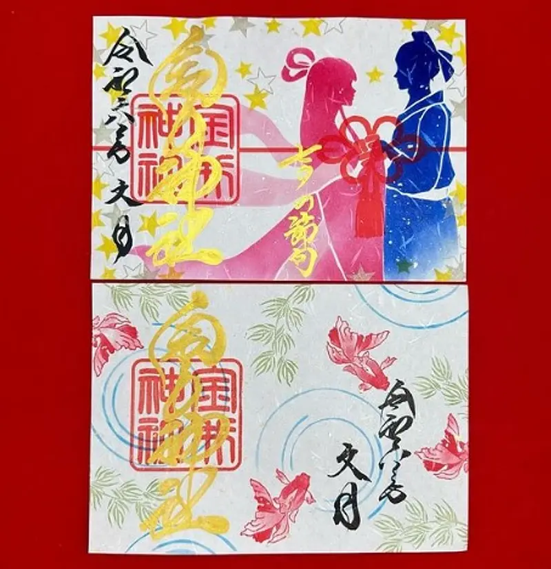 7月の月替御朱印のテーマは「朝顔・青紅葉」。夏の空下に咲く朝顔の花と青紅葉が爽やかな御朱印。また、特別御朱印は織姫と彦星のロマンティックなシルエットと、涼やかに泳ぐ金魚がデザインされ、夏の始まりを感じさせる2種の御朱印が登場。