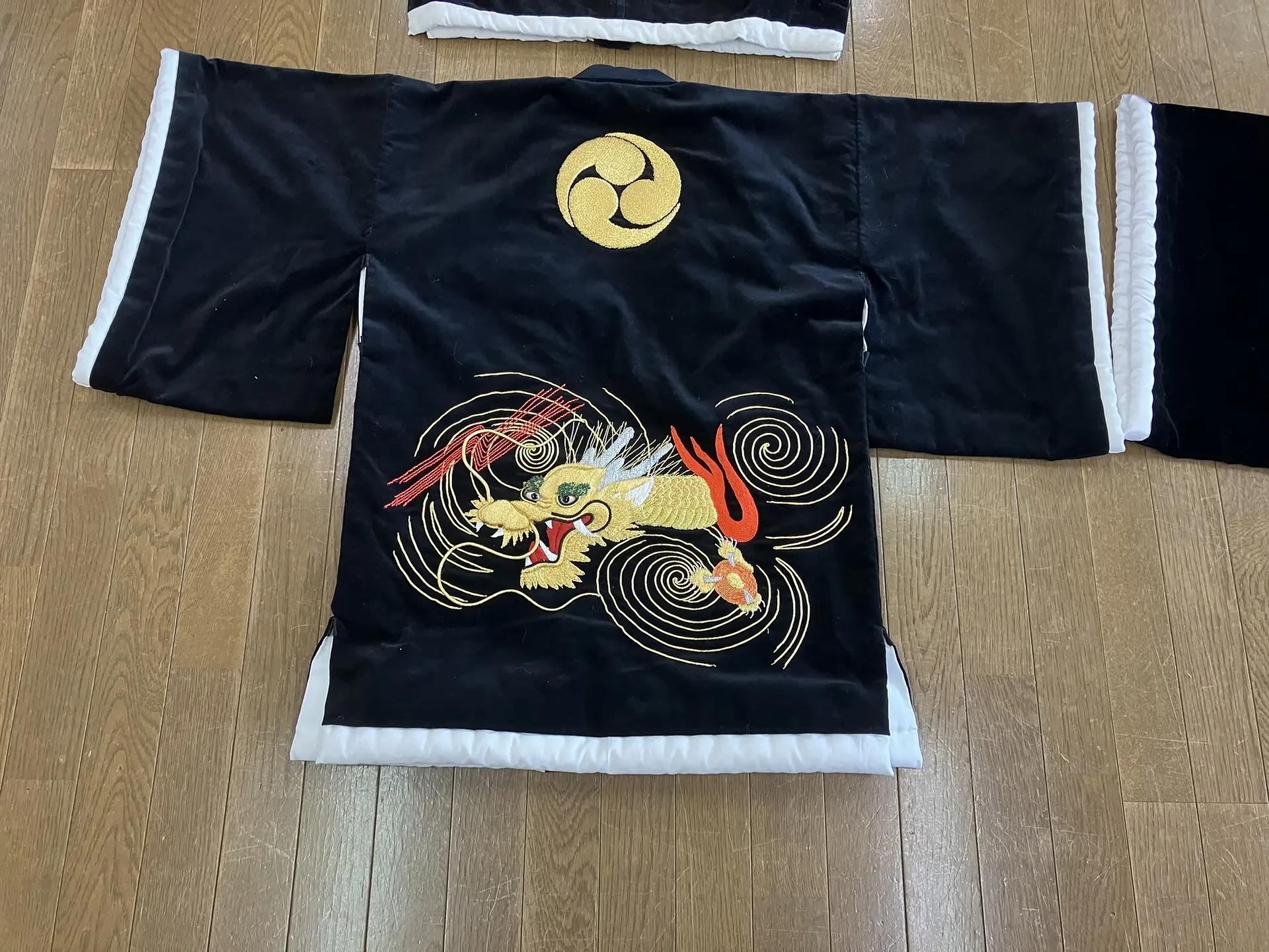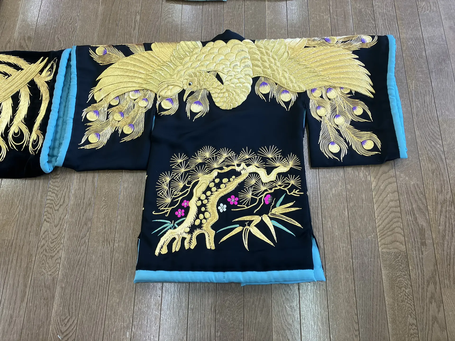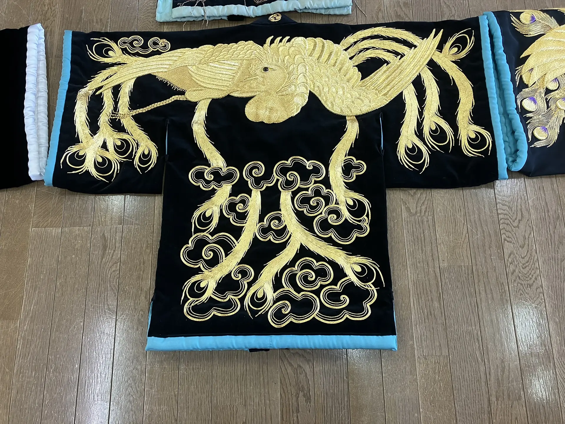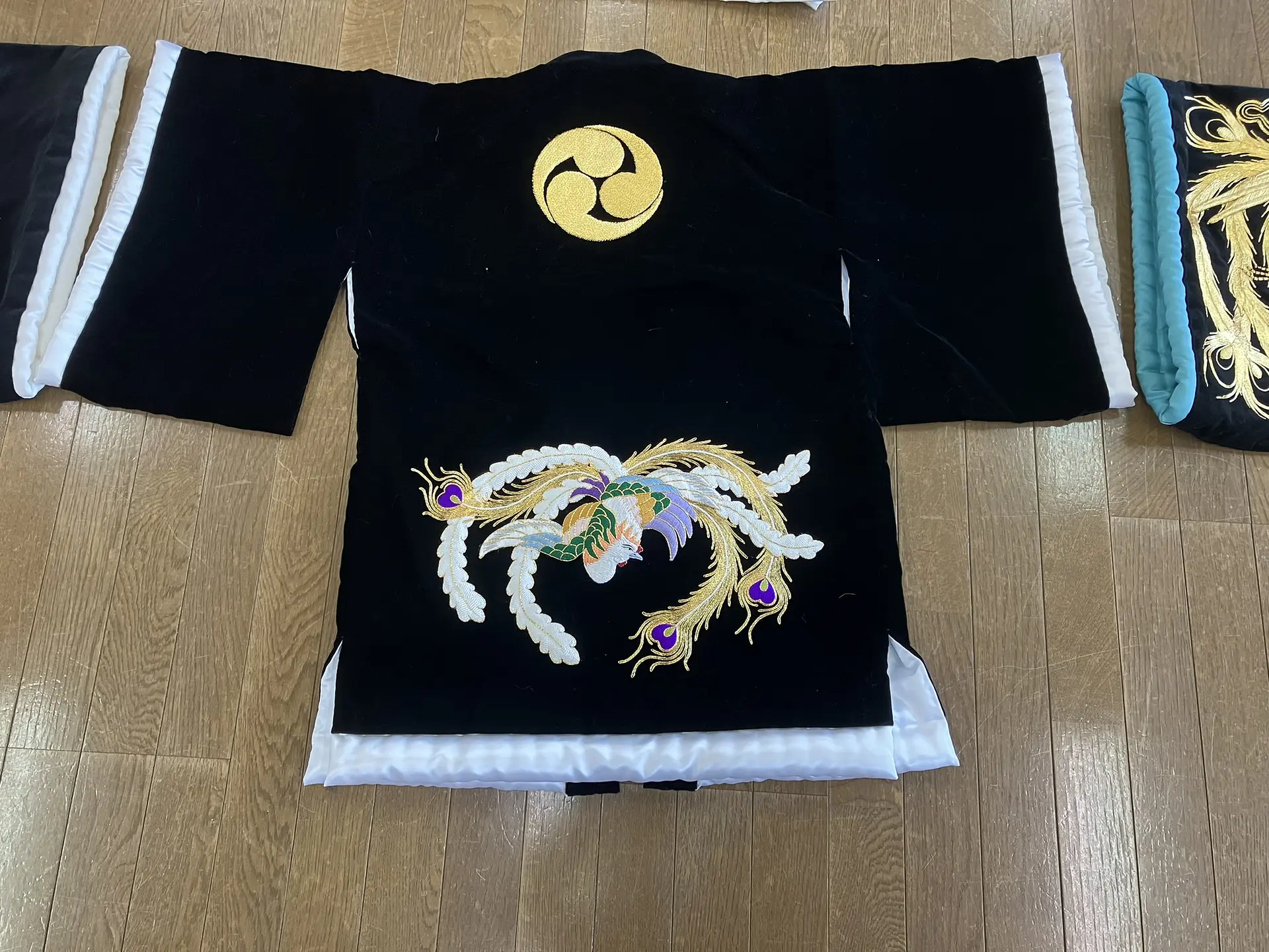 ハザシは組によって多少異なりますが、薄い色の襦袢を重ねてきて、その上に緋色に黒襟で、胸から袖先まで複数の金糸の飾り房をつけた上着を着用します。さらに本練りで鳥居をくぐるときは「正装」として必ずドンザと呼ばれる衣装を着ます。