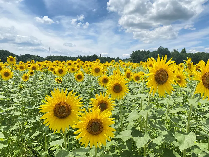 太陽に向かって元気に花を咲かせるひまわりの花🌻。一面に並んで咲く黄色いひまわりは、見る人々に元気とパワーを与えてくれる、夏の絶景です。