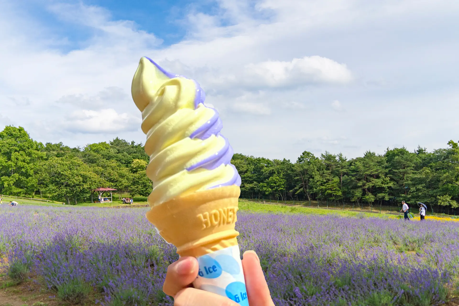 また、ハーブガーデンのソフトクリームは、ラベンダーとカモミール、その2種類のミックスがあります。ラベンダーとカモミールのミックス味をいただきましたよ!すっきりとした味わいで、癒しの香りが口の中に広がります。