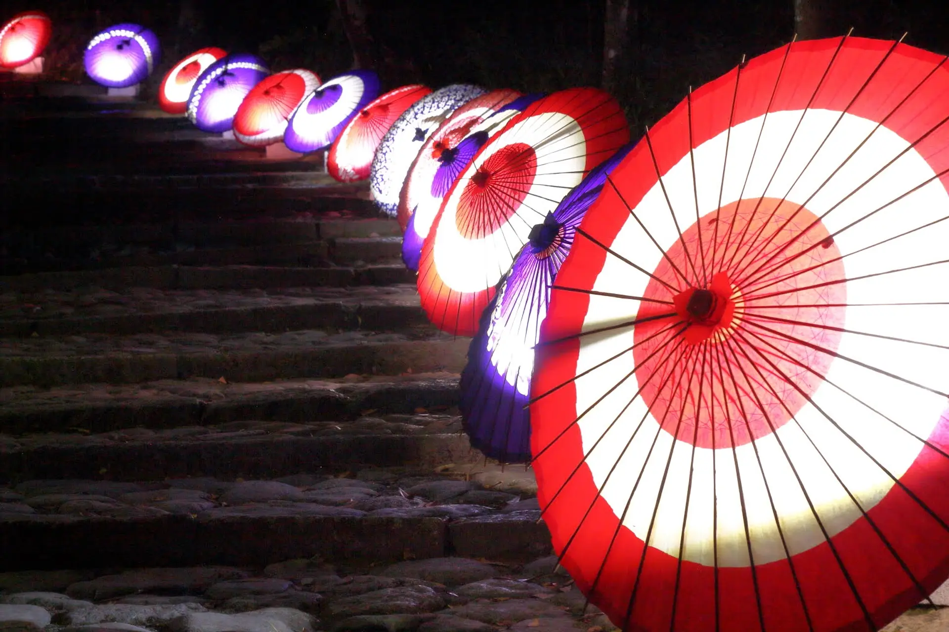 上の写真は昨年のイベントのものですが、先ほど紹介しました俳聖殿と本丸広場を繋ぐ通路(石段)脇には、灯りに照らされた和傘が並んでいて見事でした。このような施設間の通路の素敵な演出にも注目ですね。