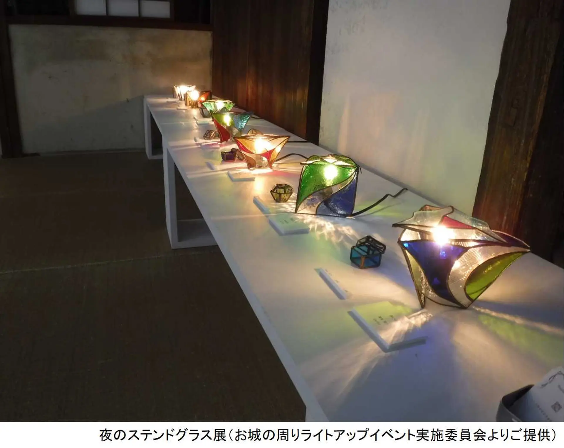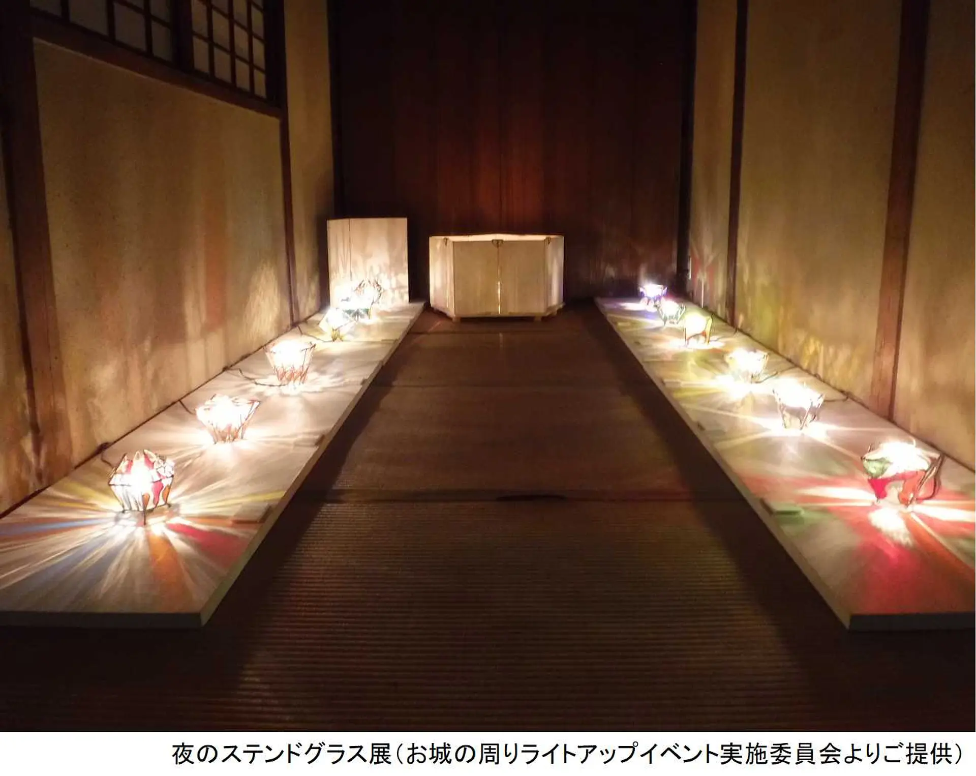 ・お城のまわりのライトアップ、夜のステンドグラス展
