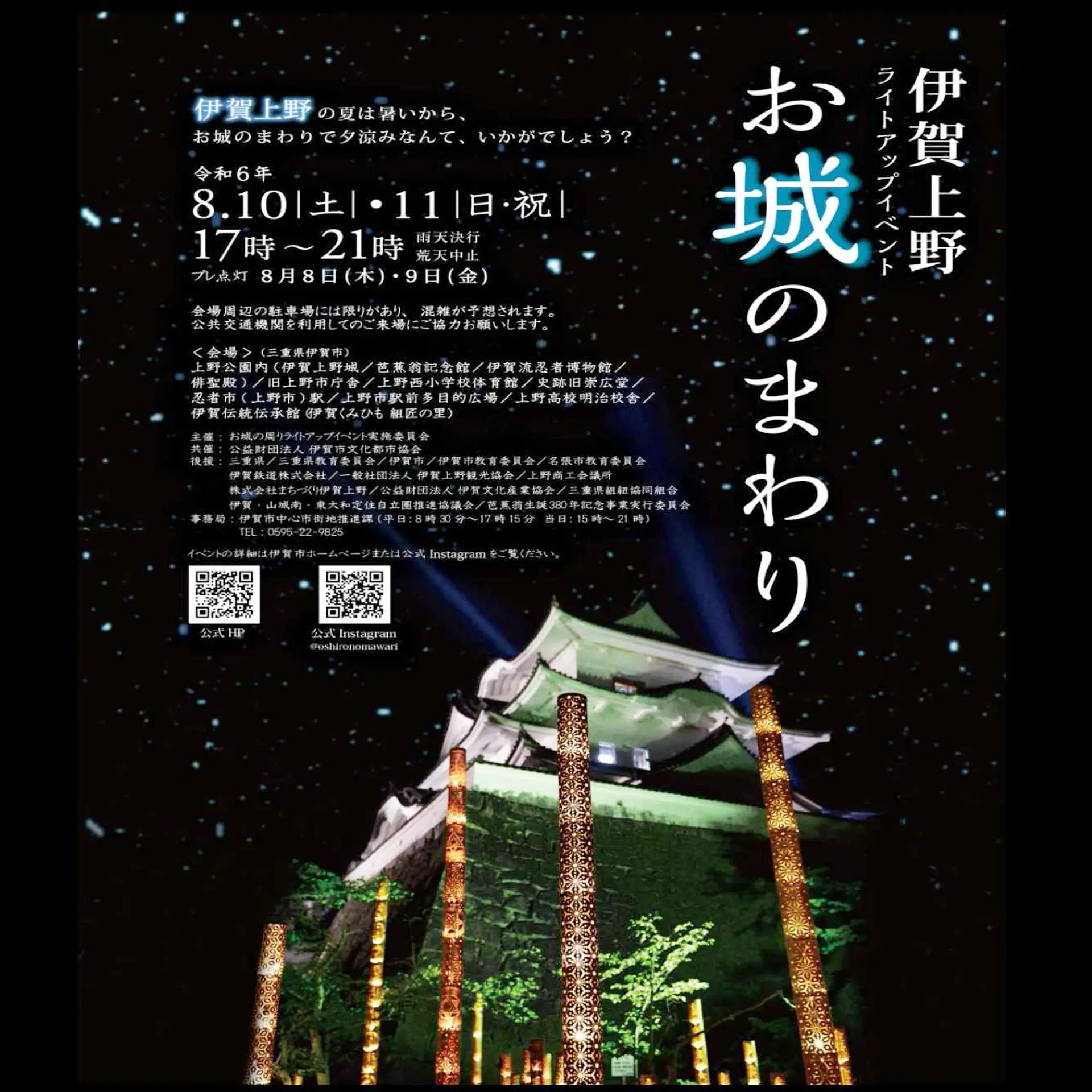 また、忍者市(上野市)駅前の多目的広場では、ナイトフードイベント「伊賀マルシェ2024夏」も初開催される予定ですので、美味しいものを食べながら、伊賀上野のライトアップイベント「お城のまわり」を観て、感じて楽しんでいただけたらと思います!