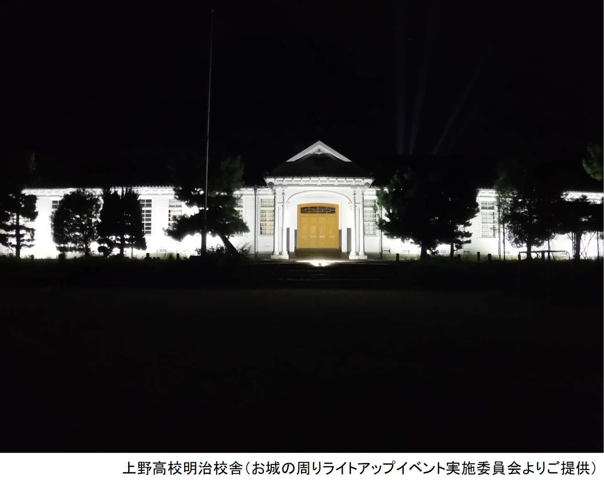 上の写真は、三重県有形文化財指定の上野高校明治校舎ですが、ライトアップされて白い校舎が美しく浮かび上がる光景を楽しめたり、