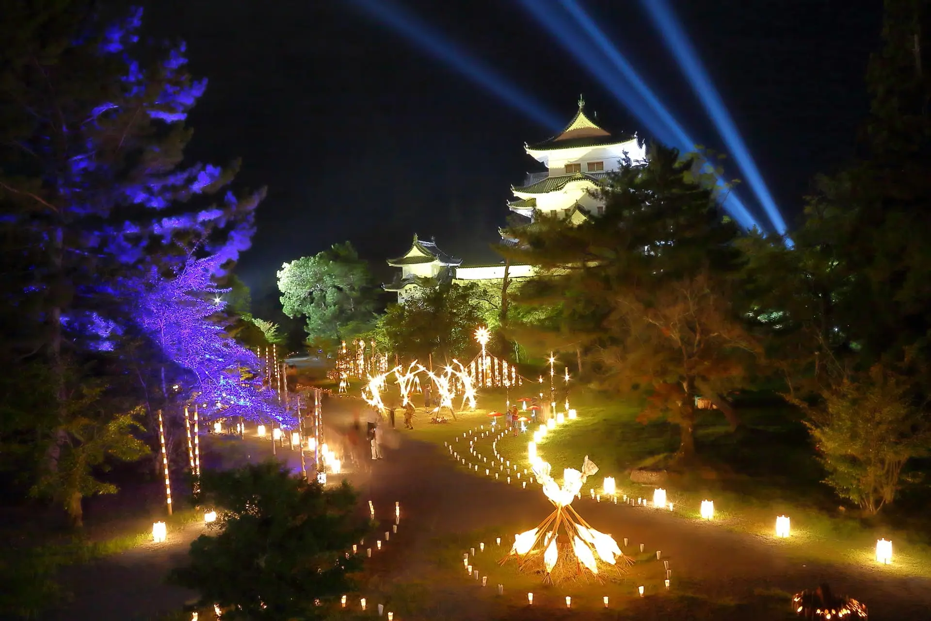伊賀上野城をはじめ、上野公園及び周辺の城下町の文化財施設や歴史的建造物が美しく幻想的な灯りでライトアップされるとともに、俳聖殿前特設ステージイベント(Night Live)、夜間特別開館(Night Museum)など見どころいっぱいのイベントです。