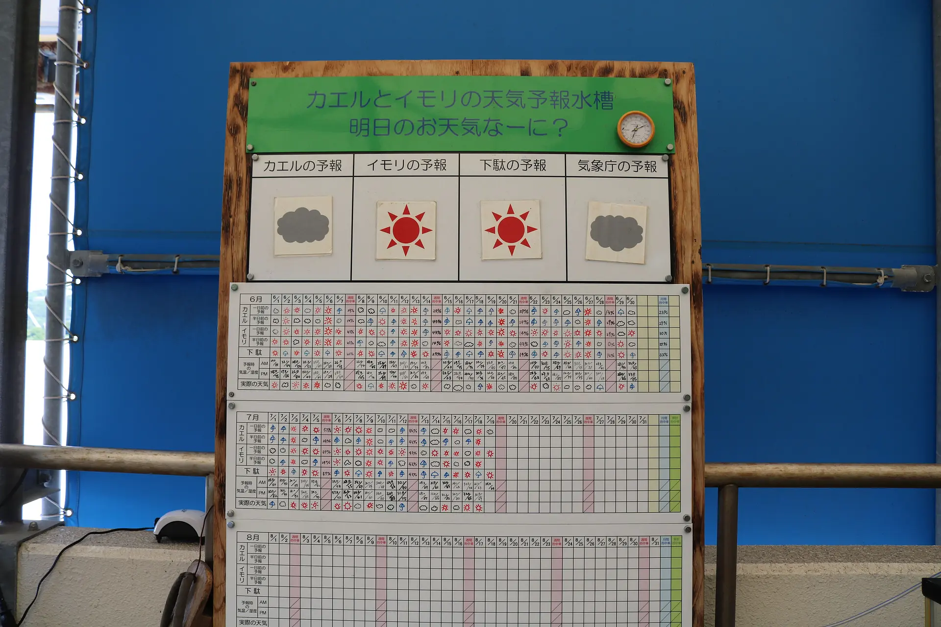 カエルとイモリの予想、そして実際の天気も展示してあるので、おもしろいですね!