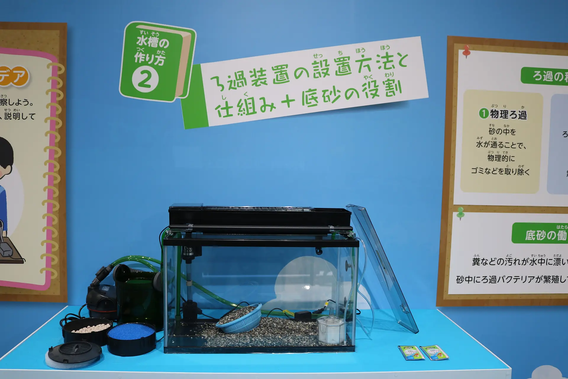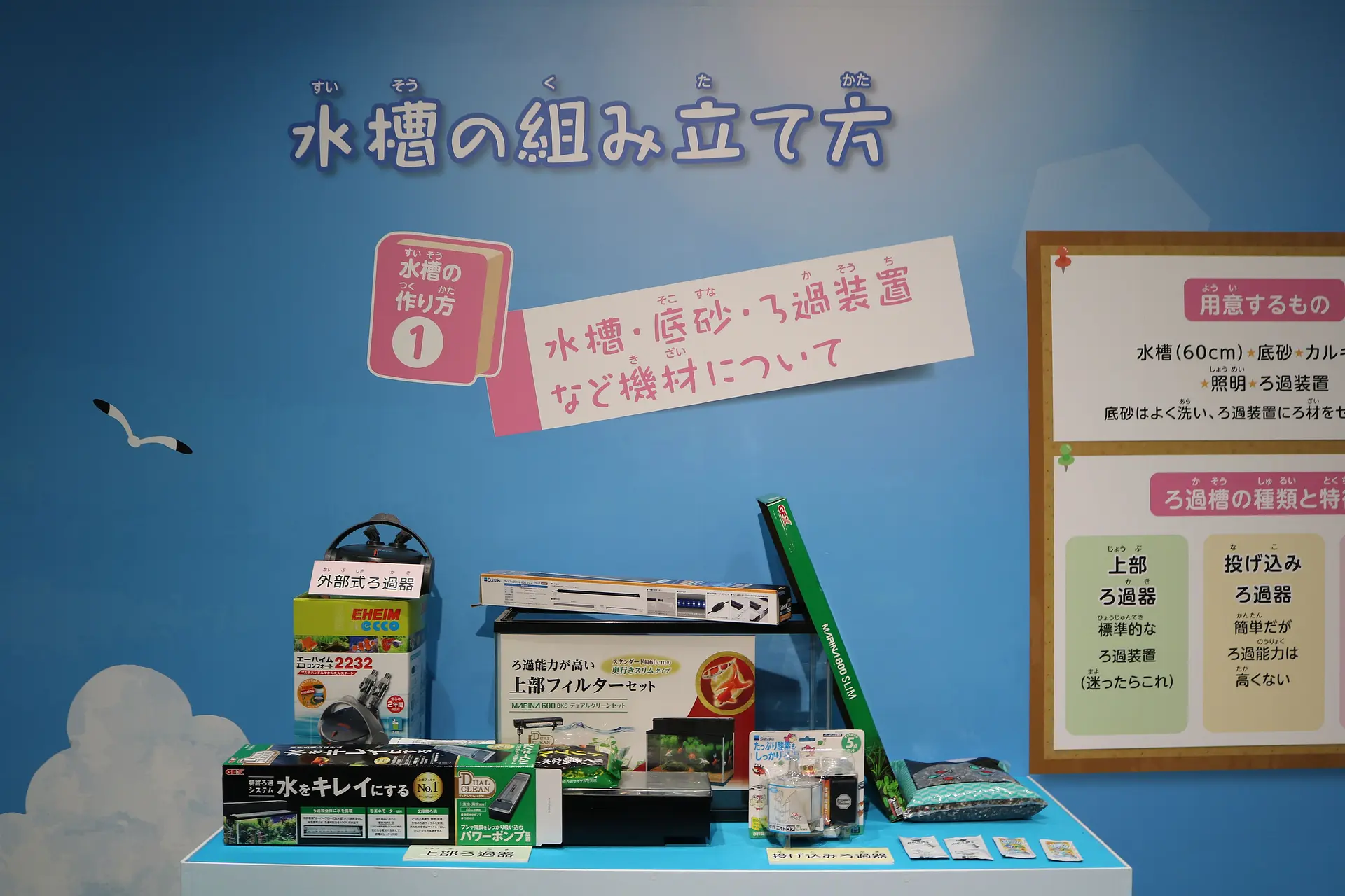 こちらでは、水槽作りのプロである飼育員さんが、水槽の組み立て方や、飼うときに必要な装置、カルキ抜きなどを解説してくれています。