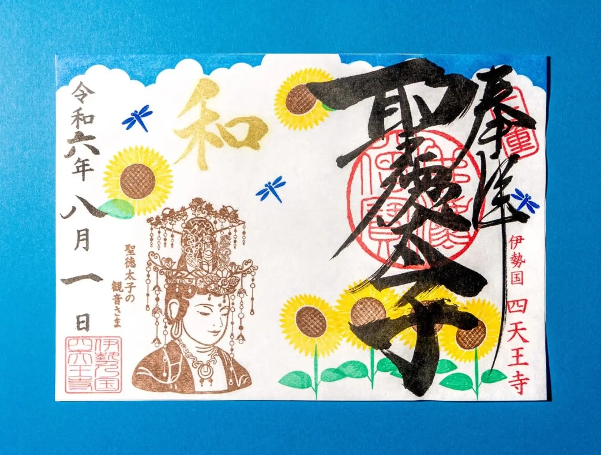 8月の限定御朱印は、ひまわりと観音様がデザインされた御朱印。私たちの成長を喜んでくれたご先祖さまを身近に感じられる季節。幼少期に夏の思い出を作ったように、今年の夏もたくさんの想い出を作っていただきたいという思いが込められています。
