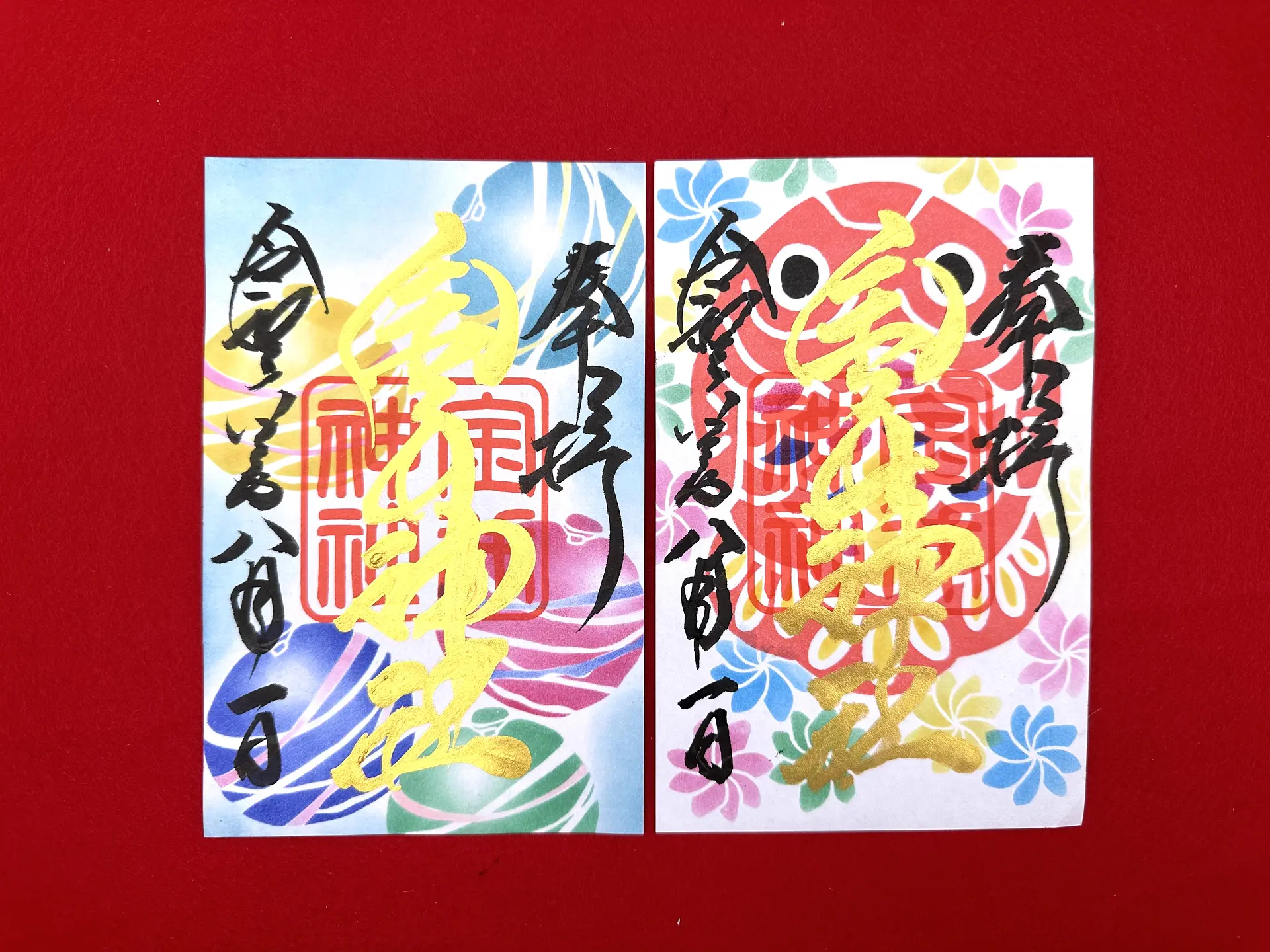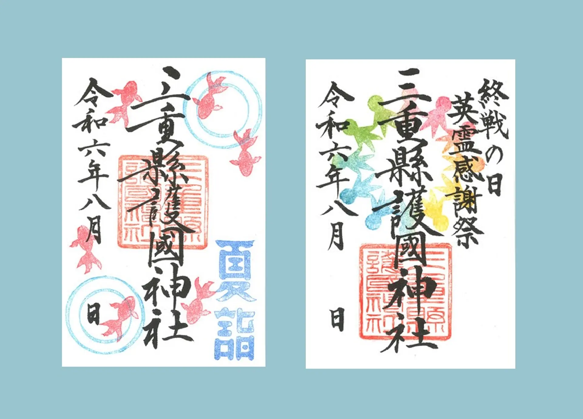 8月限定の御朱印は、金魚と水の波紋がデザインされた夏詣での御朱印と、終戦の日の英霊感謝祭の御朱印をいただくことができます。
