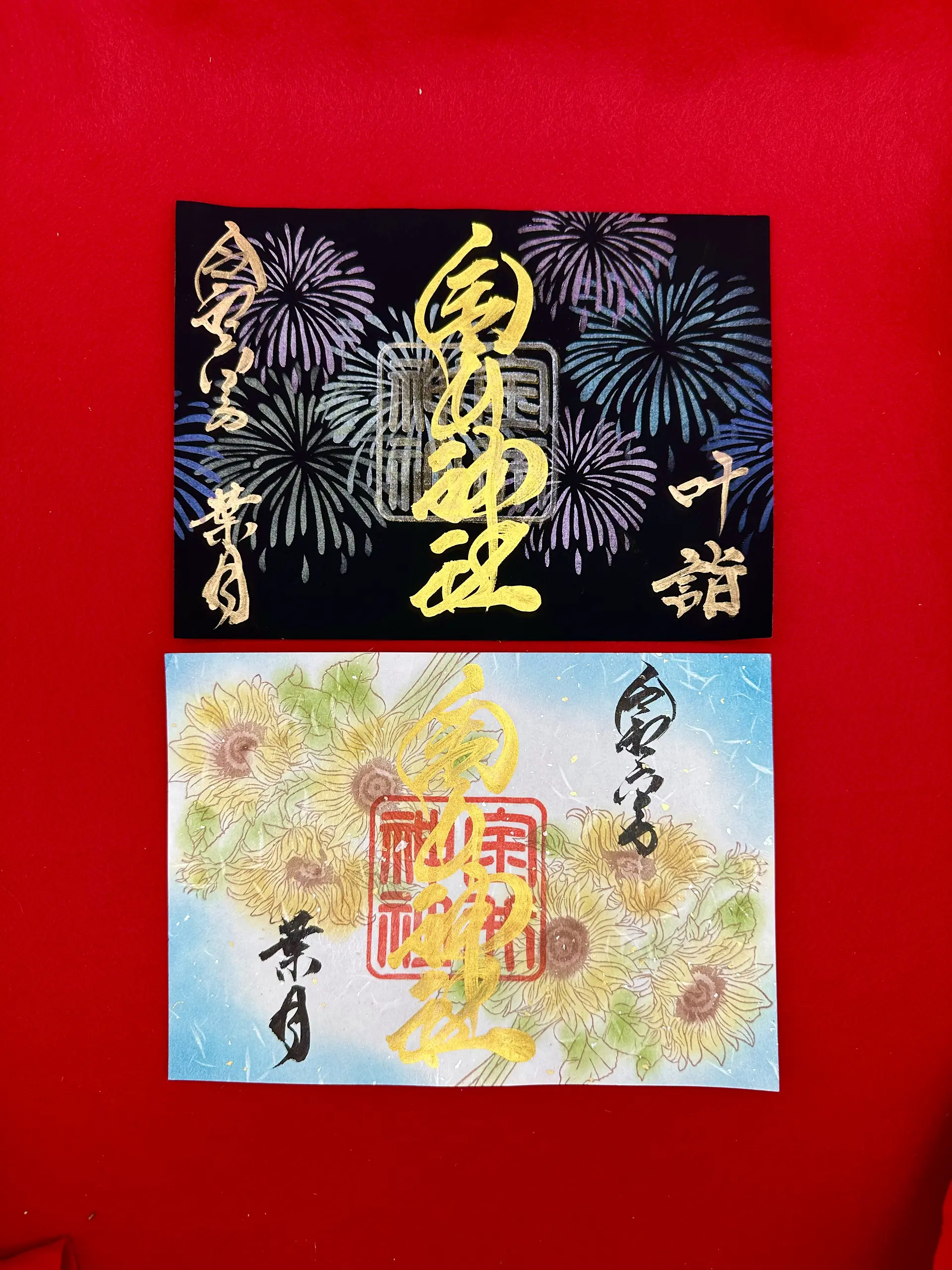 8月の月替御朱印のテーマは「金魚・水風船」。昔懐かしいブリキの金魚と躍動感のある色とりどりの水風船がデザインされています。また、特別御朱印として黒地に華やかな花火、柔らかなタッチで描かれたヒマワリの御朱印が登場。