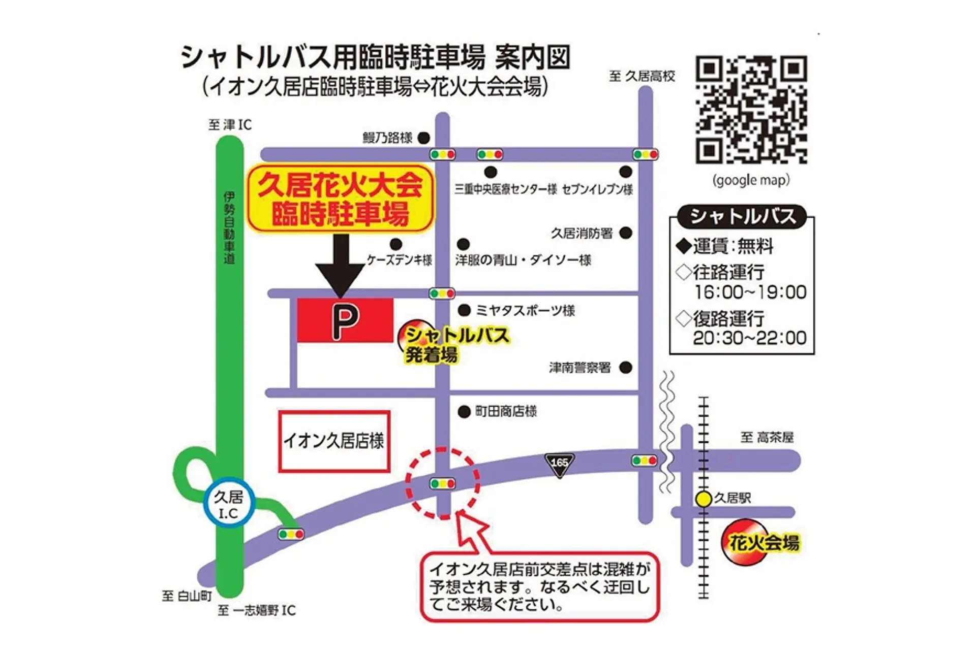 当日はイオン久居店の駐車場が臨時駐車場として利用できます。会場までシャトルバスが運行されます。