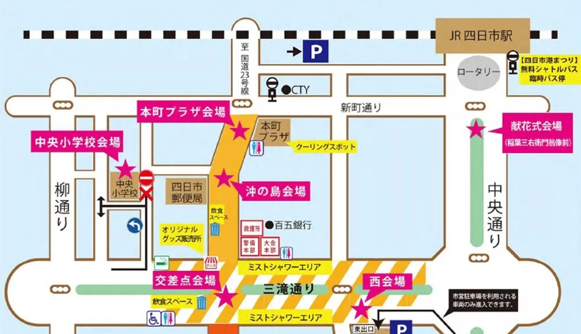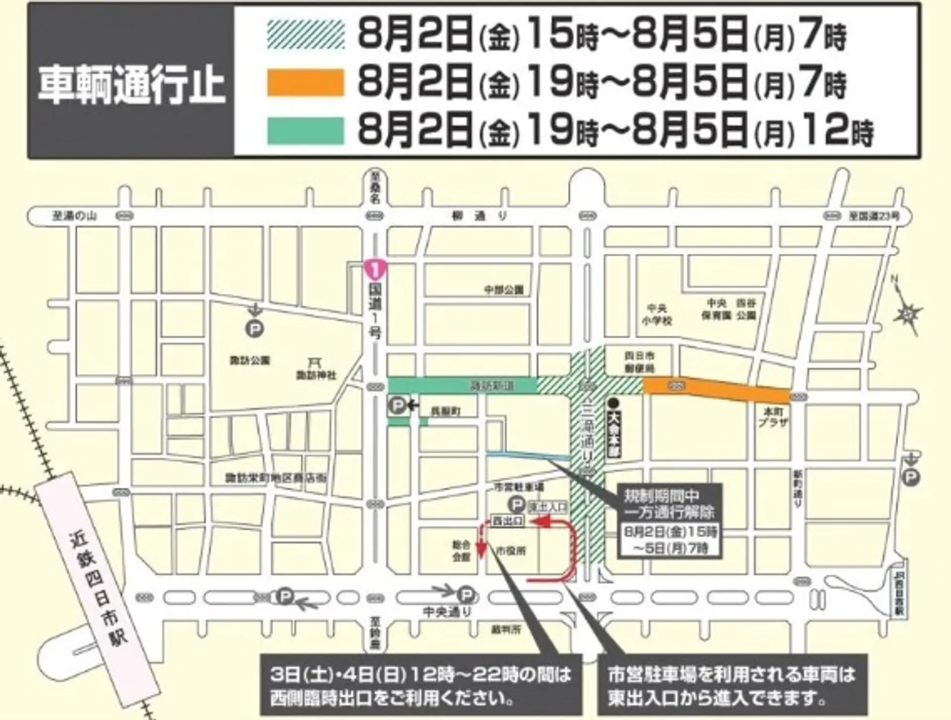 当日会場周辺は混雑が予想されます。大四日市まつり開催の前日(2日)から開催翌朝まで、交通規制が実施されます。