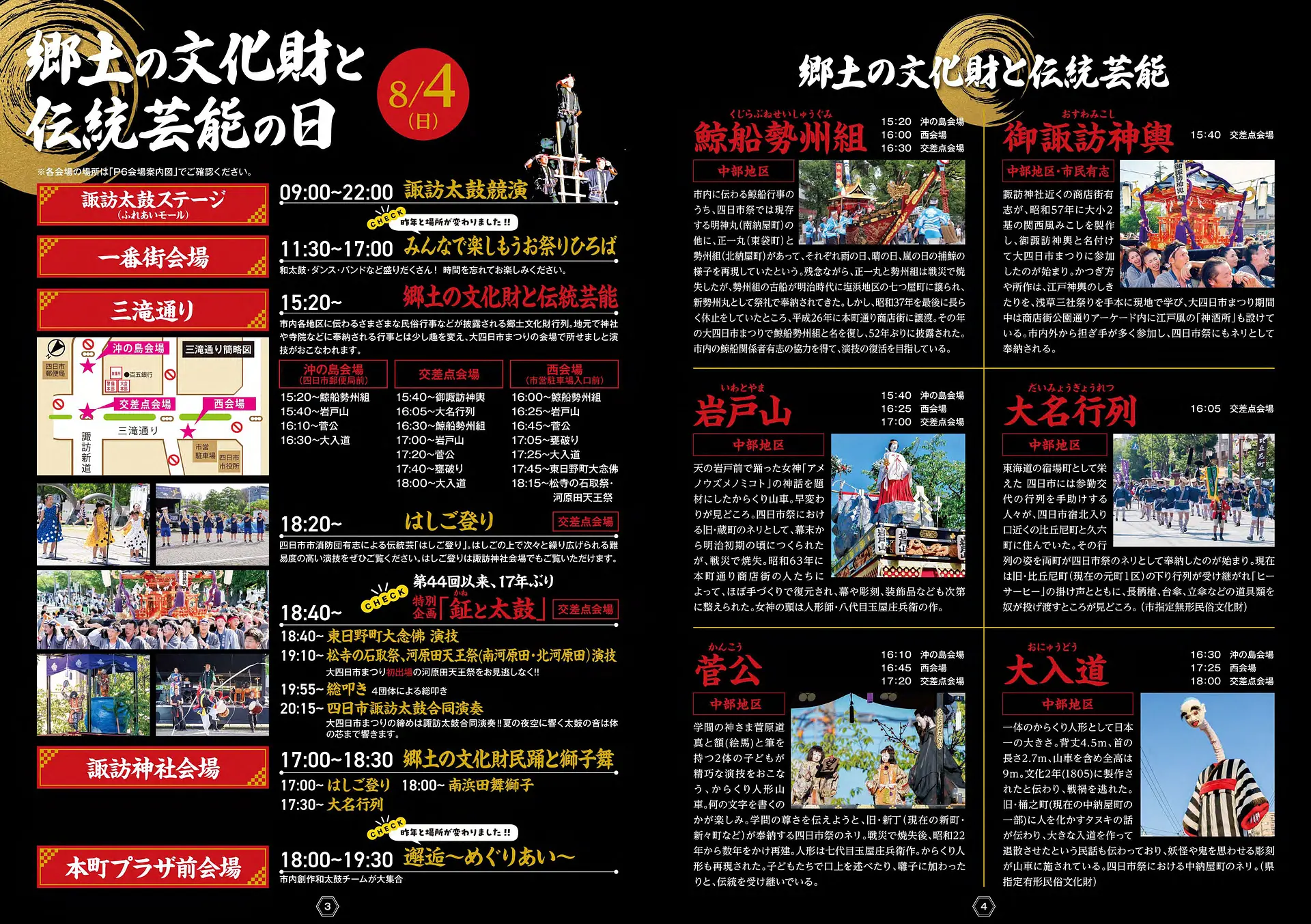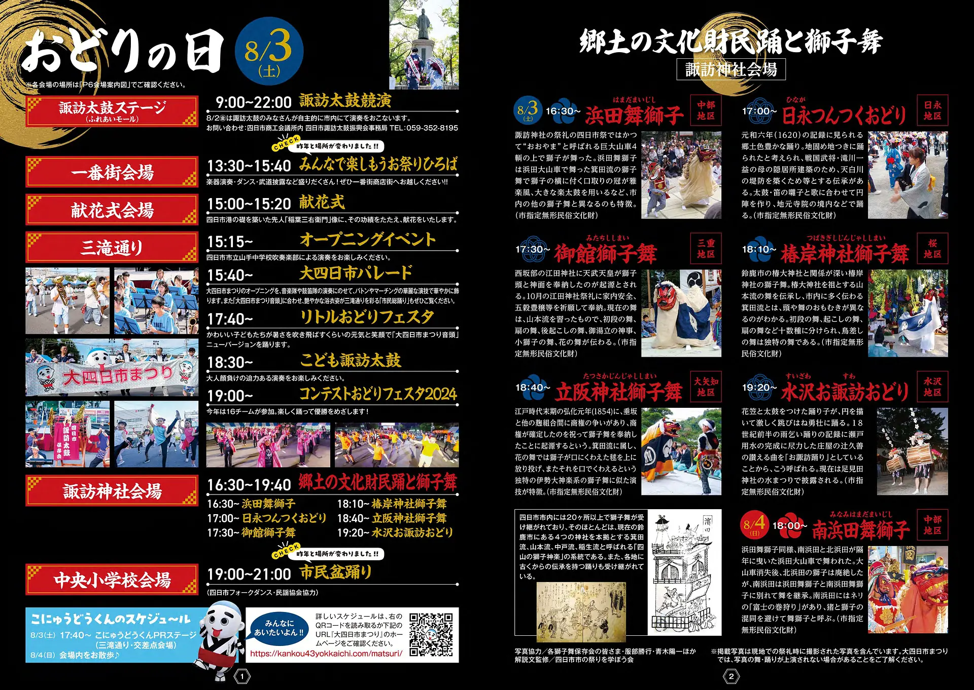 初日の8月3日(土)は諏訪太鼓競演に始まり、大四日市パレードやおどりフェスタ、郷土文化財民踊と獅子舞が。