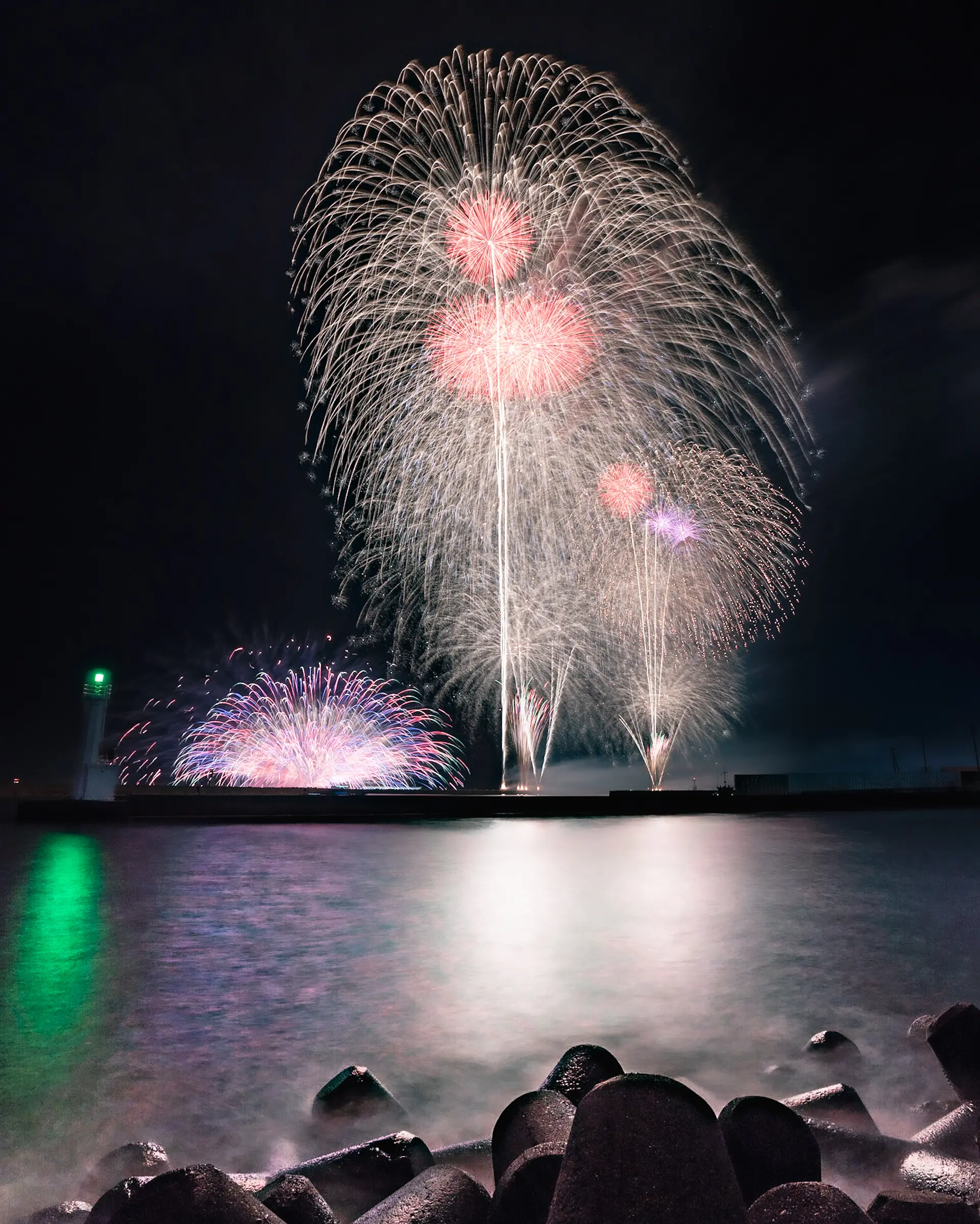 ひとつひとつの大きさは三尺玉にこそおとるものの、連続で水上花火が咲き誇るさまはきっと思い出に残るはずです♪