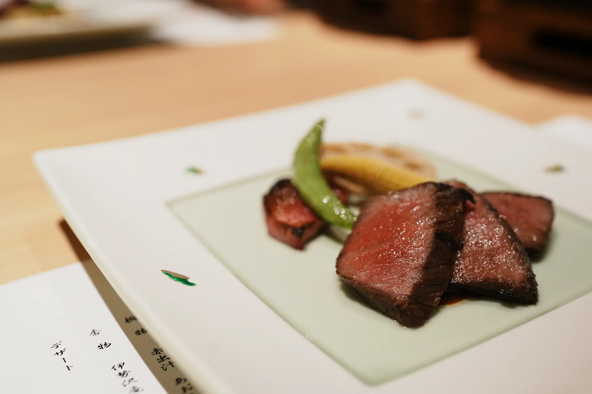 松阪牛の低温ローストに山椒ソース。とても柔らかく、噛むたびに上品な肉の旨みが広がります。