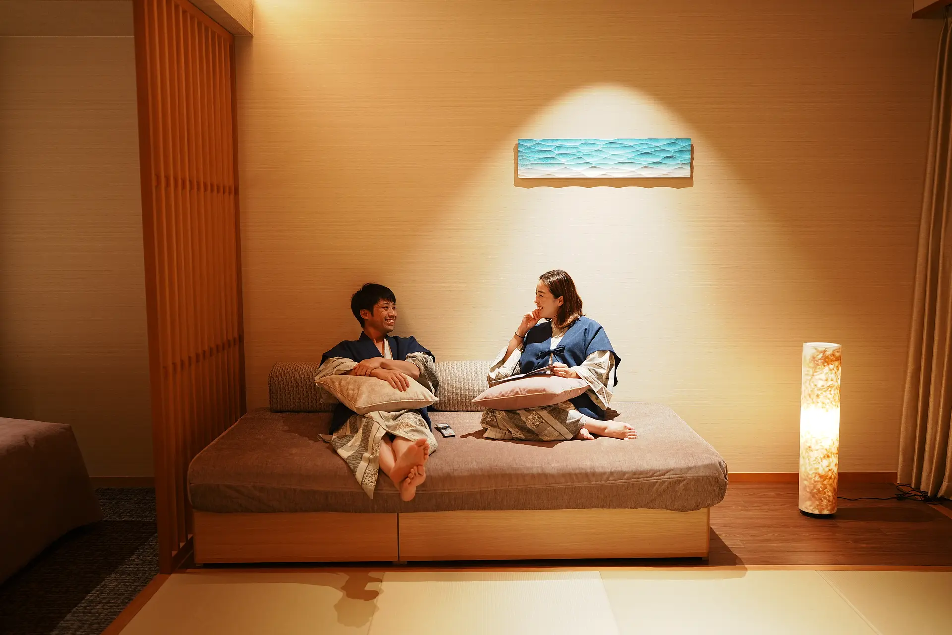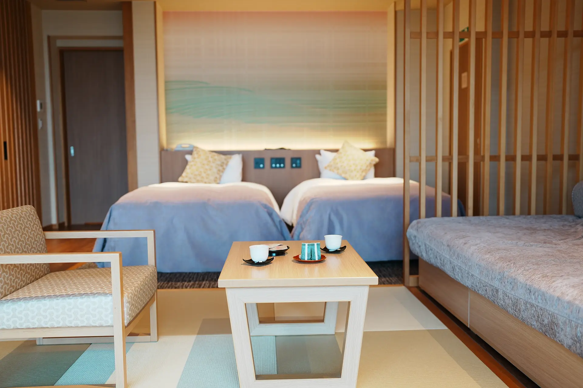 新設されたジュニアスイートは鳥羽湾を一望できる贅沢な部屋。ベッドルームの他に畳スペースやシャワールームも完備。