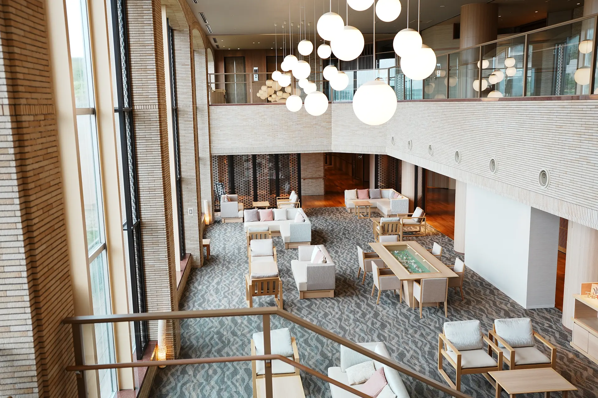 一面ガラス張りの自然光溢れる開放感あるロビー。