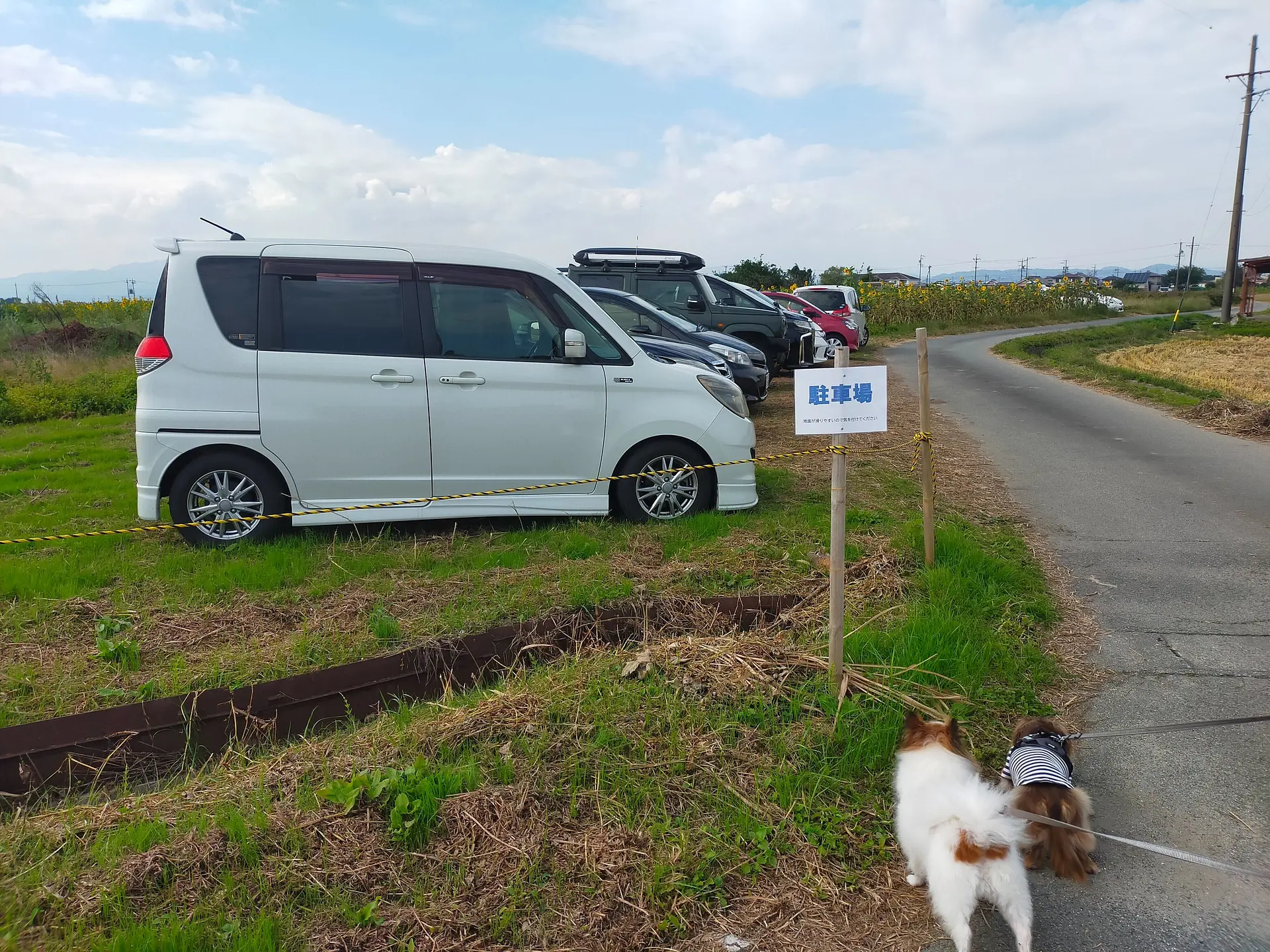 駐車場はひまわり畑の横にあります。県道698号沿いの北側に5台程度駐車できるスペースがあります。2024年は写真のように駐車場の看板は出ていませんが駐車は可能です。停められる台数は少ないですが入れ替わりが早いので、満車の場合は少し時間を置いて再訪しましょう。